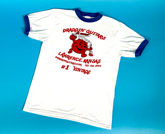 Draggin' Guitar "Drink Up" T-shirt White with Blue Ringer Red/Black ink