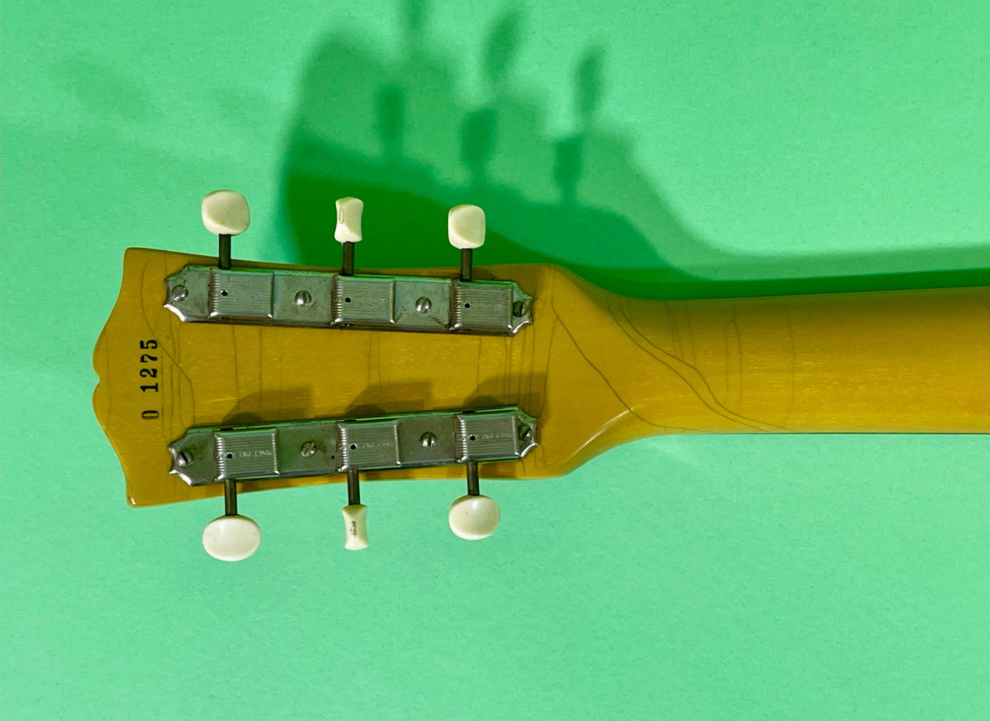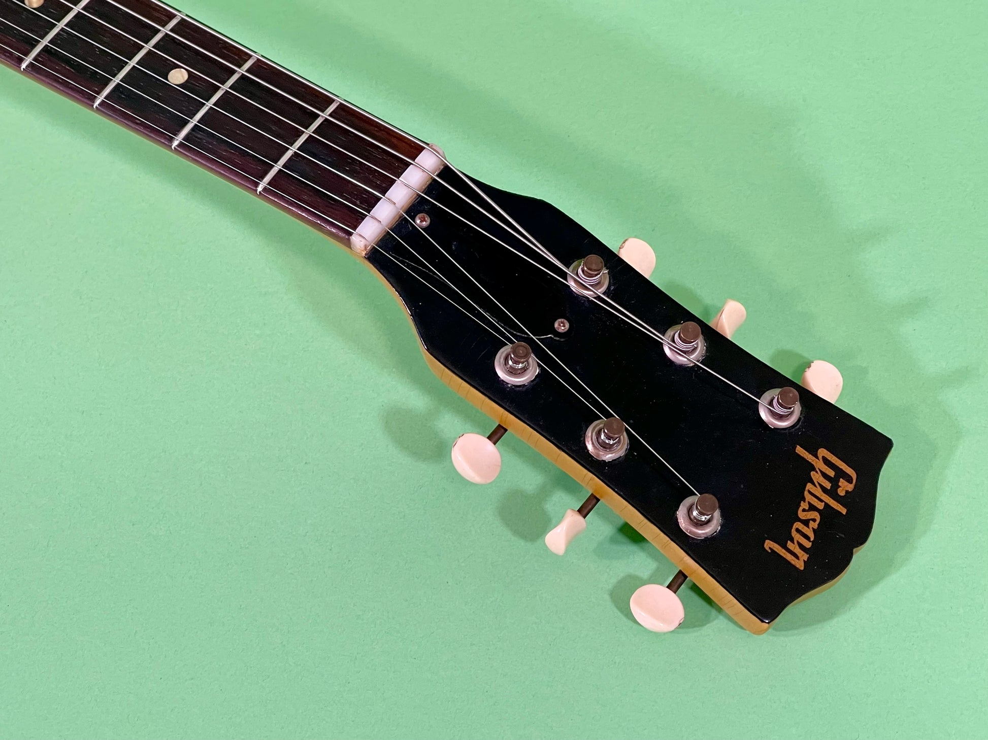 The neck itself is a classic '59 profile: not too angular and thick like a '58, but bigger than a typical '60. It has the wide nut which measures 1 11/16" wide. The neck depth measures .879" deep at the 1st fret and .955" deep at the 12th fret. Could it be any better? The neck is straight and smooth. The tuners are the original Kluson strip type. They function as designed. The headstock and logo are original and display Awesome with tons of checking and perfect patina-see photos. The action is set low for a fast and easy playing experience. The current string height is .010" at the 1st fret and .055" at the 12th fret. You can easily raise the string height with the bridge, if you like a higher action. The guitar plays really easily up and down the fingerboard. The Brazilian rosewood fingerboard is smooth and clean and has a soft feel. There are no dead spots anywhere and you can really pull some great bends with this guitar.