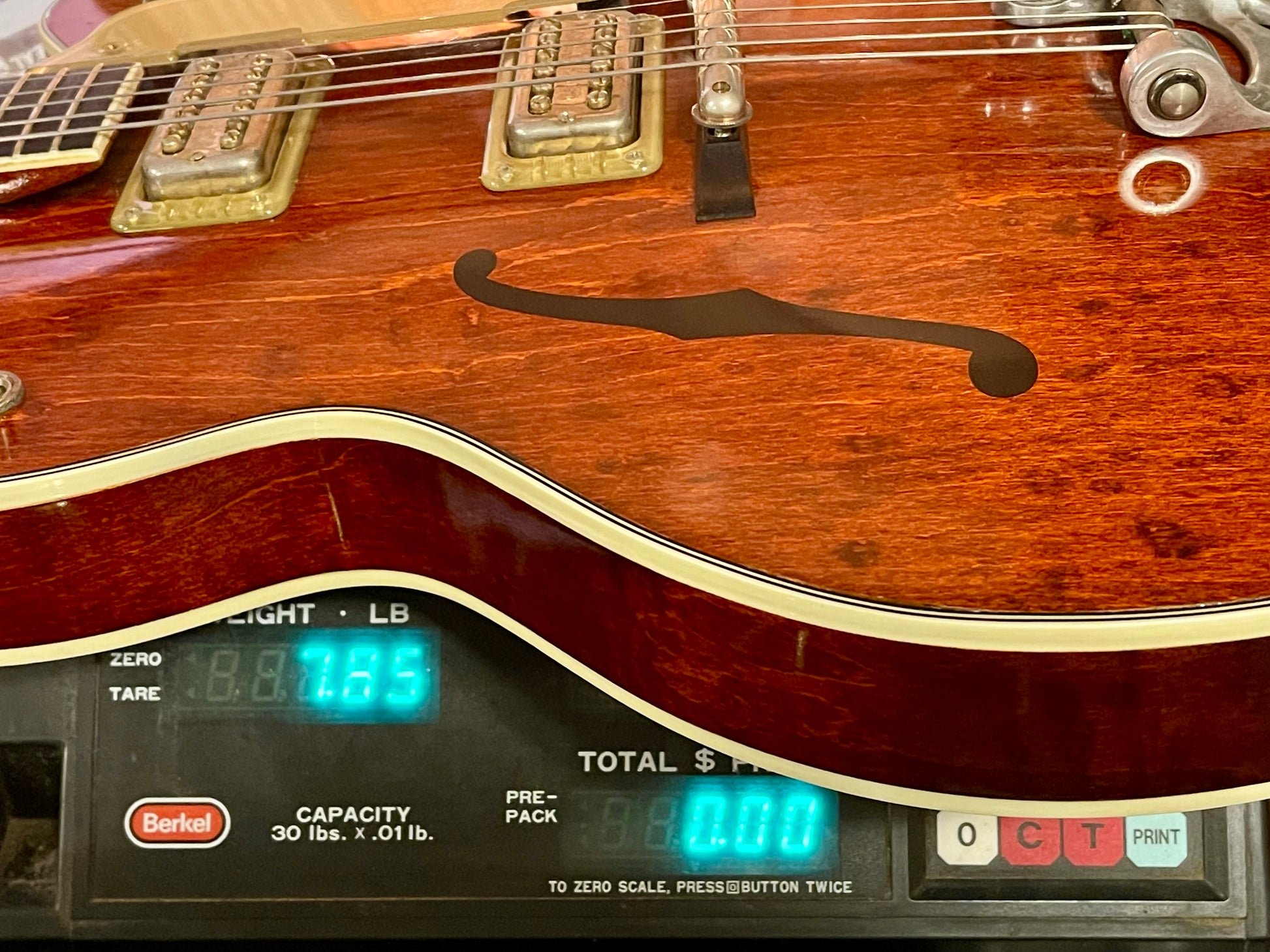 The twin Filter'Tron pickups both have an excellent signal and high-clarity as you would expect. They provide a nice twang with smooth definition and a bit of sparkle. The guitar sounds great through any quality tube amp. The pickups measure 4.18 ohms in the bridge position and 4.58 ohms in the neck position-perfect for Filter'Trons. All of the electronics, potentiometers and switches function smoothly and quietly. The pickguard is nice and flat with the typical stress line around the screws. It is solid and a nice gold metallic color. The original Bigsby tailpiece functions smoothly. The gold hardware has some fade but is really in very good condition for one of these 65 year-old Gretsch pieces. Plenty of gold left to impress and dazzle.