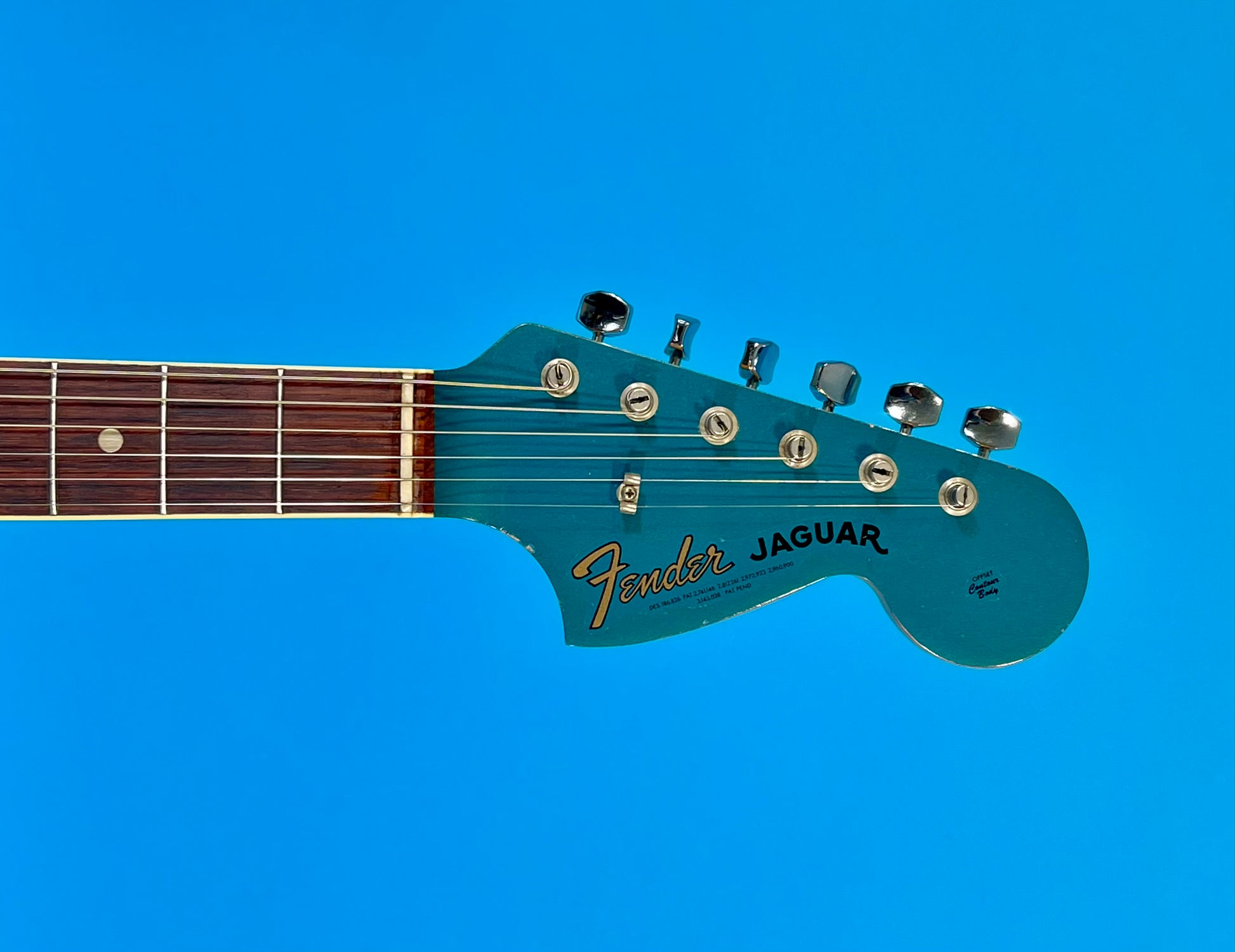 When it comes to Custom Color Fender guitars, everyone has their favorite. Certainly near the top of my list is Lake Placid Blue and I think it looks really amazing on a Jaguar. Like this one, for instance. This unit was produced at the original Fender factory in Fullerton, California U.S.A. in 1965. It is 100% original and 300% gorgeous! It is set up and ready to go-it needs nothing. You probably already know how rare Custom color Jaguars are-and this one is even rare than most. For the Jaguar model, Fender added binding to the neck in early 1965 and in early 1966, they changed the position markers to blocks. This one still has dots. Dot position markers with binding, a one-year only feature and yes, that is the same as Kurt Cobain's sunburst Jaguar.