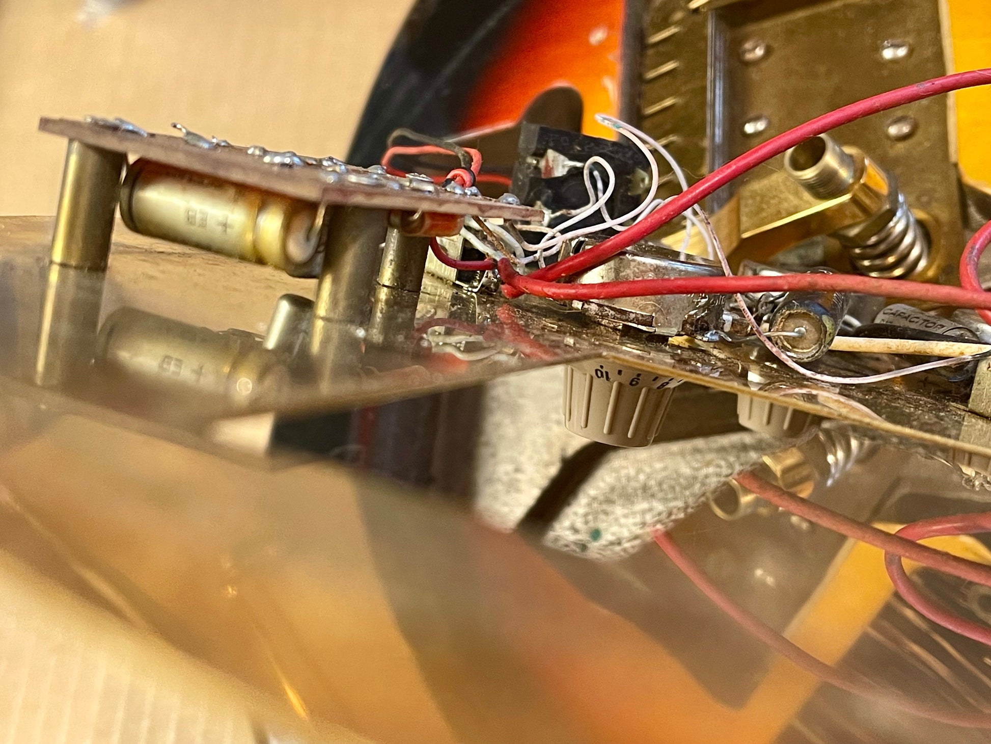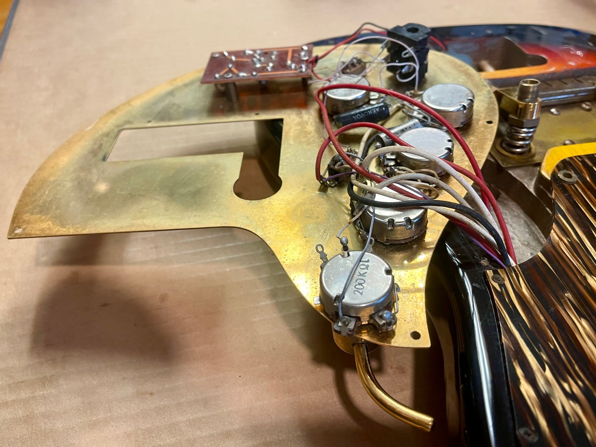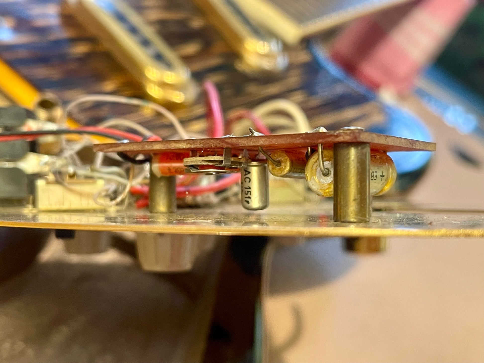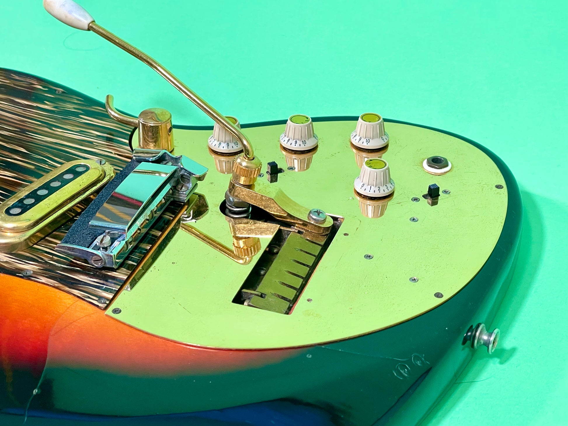 The pickups are single coil with exposed pole pieces (kinda like a Fender Jaguar)...they both have an excellent signal. The neck position measures 6.50 ohms and the bridge pickup measures 6.63 ohms. The controls and various switches all function. The wiring harness is in excellent condition. These mini-slider switches collect more dust than my 'honey-do' list; so cleaning maintenance is recommended every now and then-maybe during string change (also: just like a Fender Jaguar) The control plates look like mirrors in the photos and that seems to be what happens whenever they get a any light exposure. There is light patina (mostly just tiny stain spots) that I attempted to show from a shallow angle-see photos. Even in dim lighting-the reflection is pretty breath-taking. On stage-it looks like you are going super-nova! Can they handle it? You'll have to find out.
