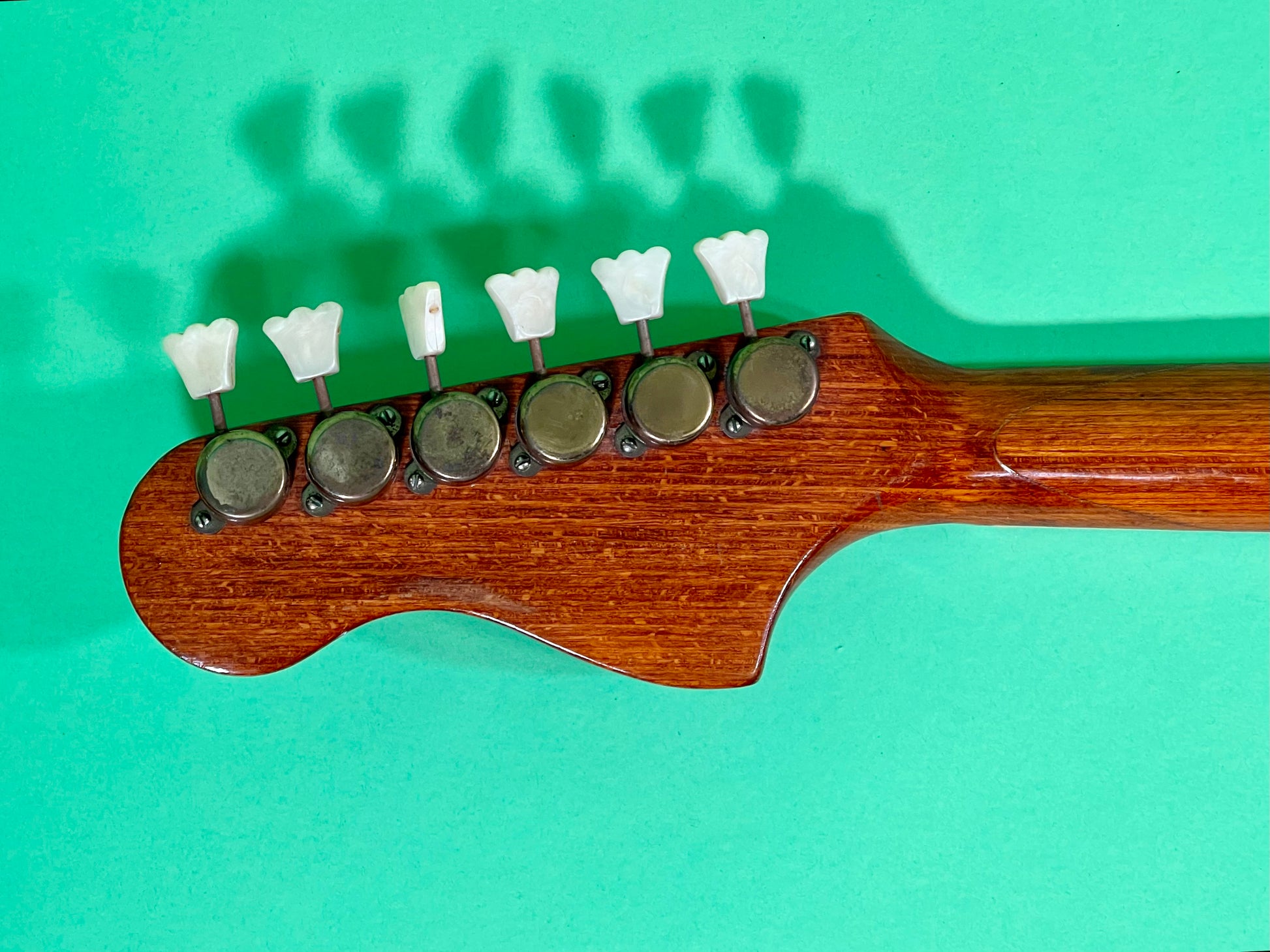 The neck itself appears to be a medium-tint stained maple construction with nice linear tight grain pattern. It is a 2-piece design with the U-shaped joint near the headstock for added stability. The truss rod functions and the neck is nice and straight. It has minimal relief and no twisting or other funny business. The profile is best described as a slim-C shape. It measures 1.58" wide at the nut and the neck depth measures .804" at the 1st fret and .823" at the 12th fret. The tuners are the original sealed back units with the beautiful pearloid Tulip button-these are same type that Hofner used as well. They function smoothly and just look classy as all get-out. The headstock and logo display excellent with a touch of patina-see photos. The Gold Framus logo on the Black painted face is a KILLER look! The headstock shape is VERY similar to a Fender Jaguar (I detect a pattern!) The Rosewood fingerboard is super clean and nice and smooth. The White Binding is in great condition. The frets have been professionally leveled, crowned and polished and appear crisp and super clean with an excellent height-see photos. The action is set low fro a fast and easy playing experience. The string height is currently .010" at the 1st fret and .055" at the 12th fret. The action can be easily raised by turning the 2-height adjustment screws on the bridge if you prefer a higher action. As it is-it plays very nicely with a super-light touch. There are no dead spots anywhere and it strums and picks excellent.