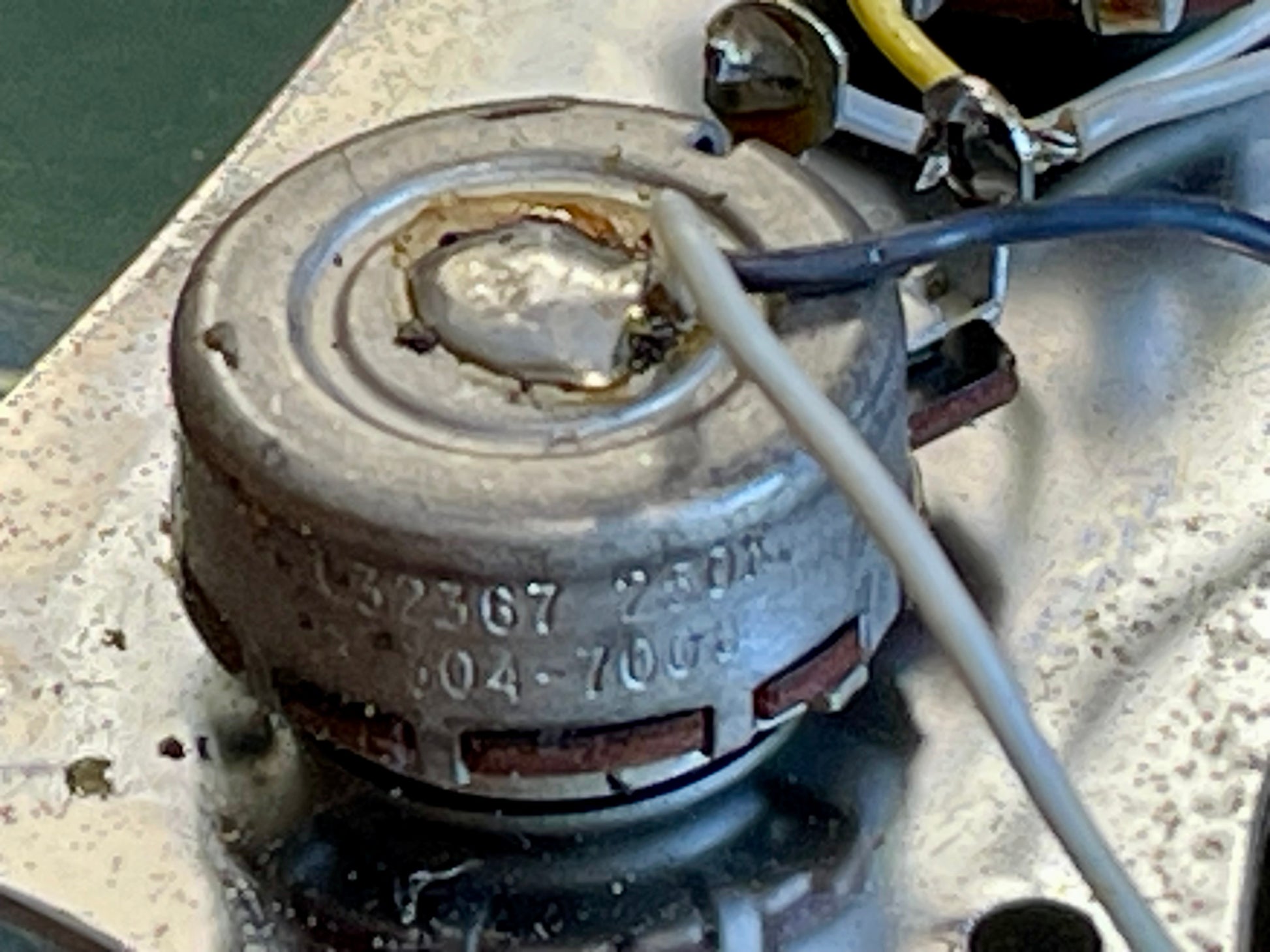 The pickups sound clear and bright. This Mustang has that quintessential Fender "bell" chime everyone loves. The switches are replacement original style pieces and they function smoothly. The pickups have clean date code stamps on the grey bobbins. The neck measures 5.45 ohms and bridge position measures 5.65 ohms. They balance perfectly. The volume potentiometer dates to the 8th week of 1970 and the tone potentiometer dates to 1970 as well. The pots are both original stackpole units and they function smoothly and quietly. The bridge is fully adjustable and the vibrato is smooth-but the guitar is missing the trem arm. The pickguard is in excellent condition, nice and flat.