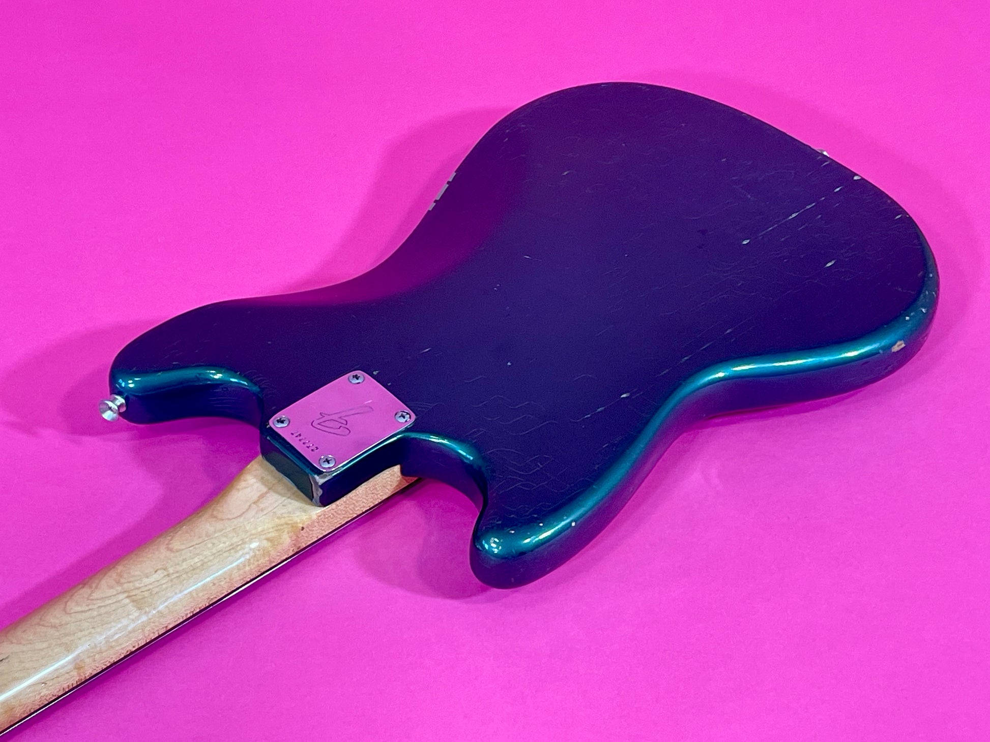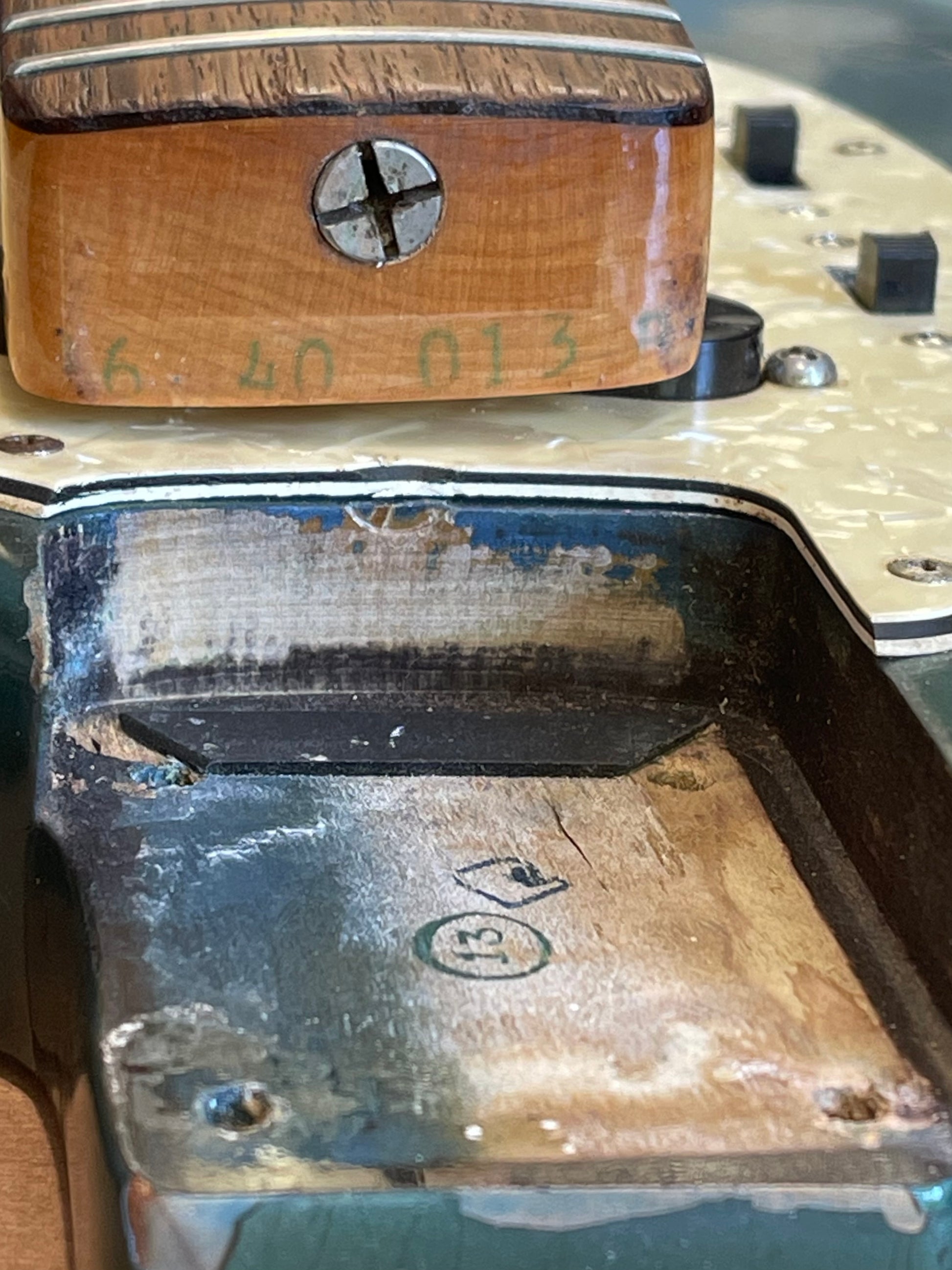 The body has the standard offset design with a nice contour for added comfort on the arm rest area and backside . The finish has toned to the beautiful turquoise hue you see here. You can view the photos under the pickguard and see the difference clearly. There are inspection stamps on the body, pickups, neck slot and end of neck also. The guitar has some chips in the finish along the edges and end of the neck slot, along with line checks and other typical signs of handling. The neck joint is solid.