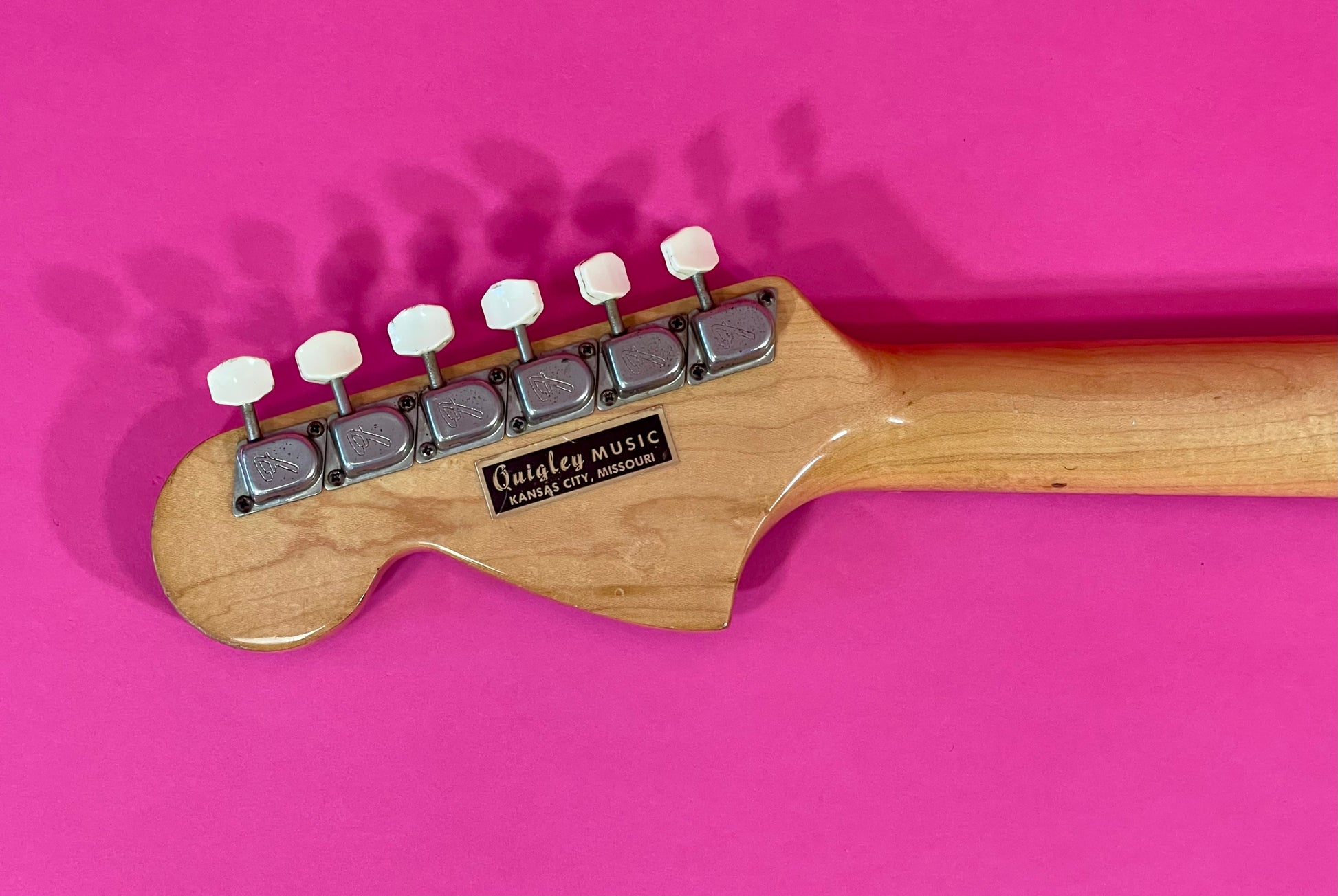 The neck itself is straight and the truss rod functions. The neck has a vintage C-shape profile and measures 1 9/16" wide at the nut. The neck depth measures .868" at the 1st fret and .933" at the 12th fret. The original tuners all function and the original "Quigley Music Kansas City Missouri" sticker is present. This was THE music store in the K.C. area. The headstock and logo display excellent-see photos. The rosewood fingerboard is super clean, smooth and in excellent condition along with the frets. The frets have been professionally cleaned, leveled and polished and appear near-new condition. The string height is currently .010" at the 1st fret and .040" at the 12th fret. It is a low action with easy to play string pressure. The guitar plays great up and down he fingerboard with no issues.