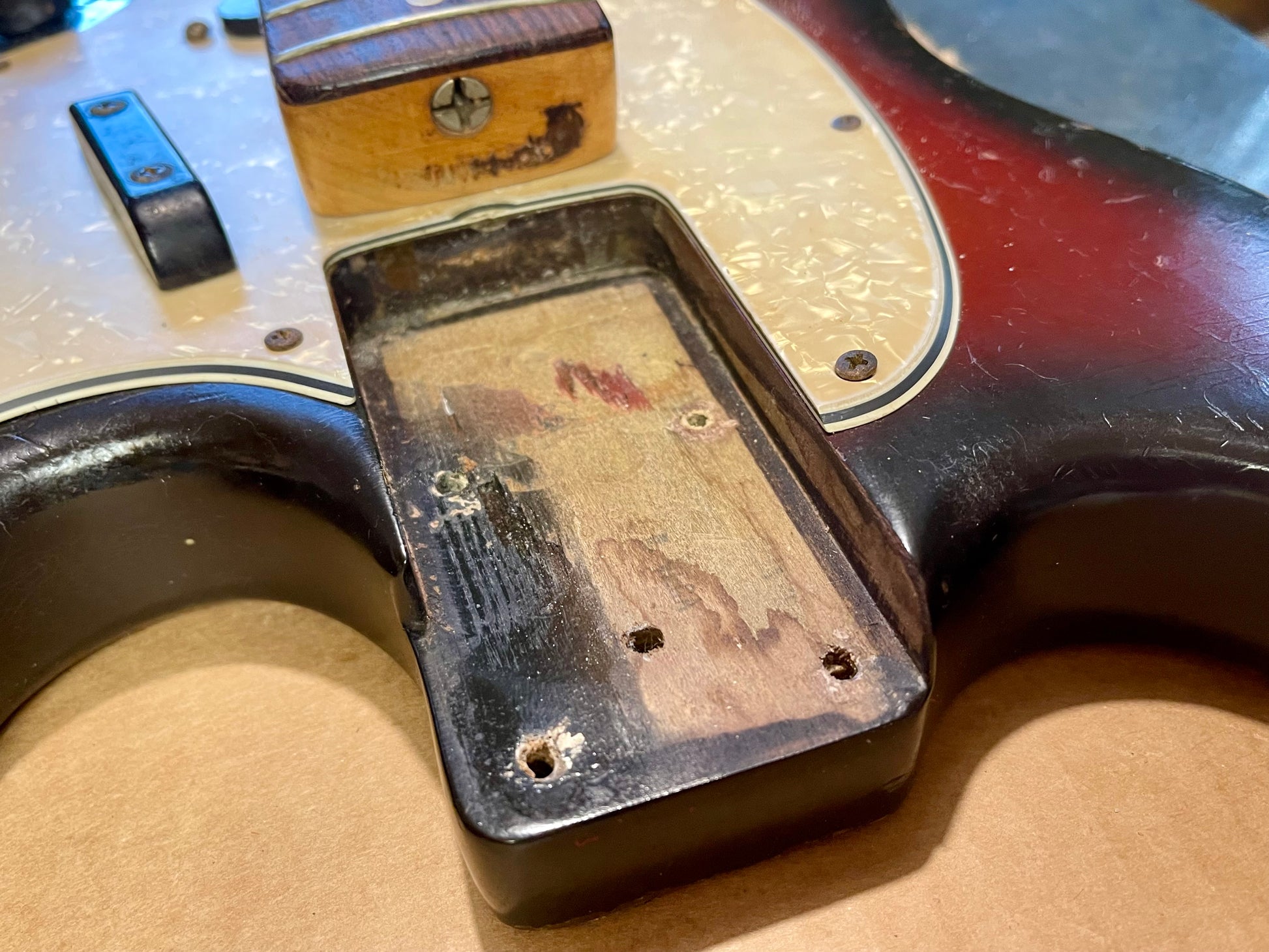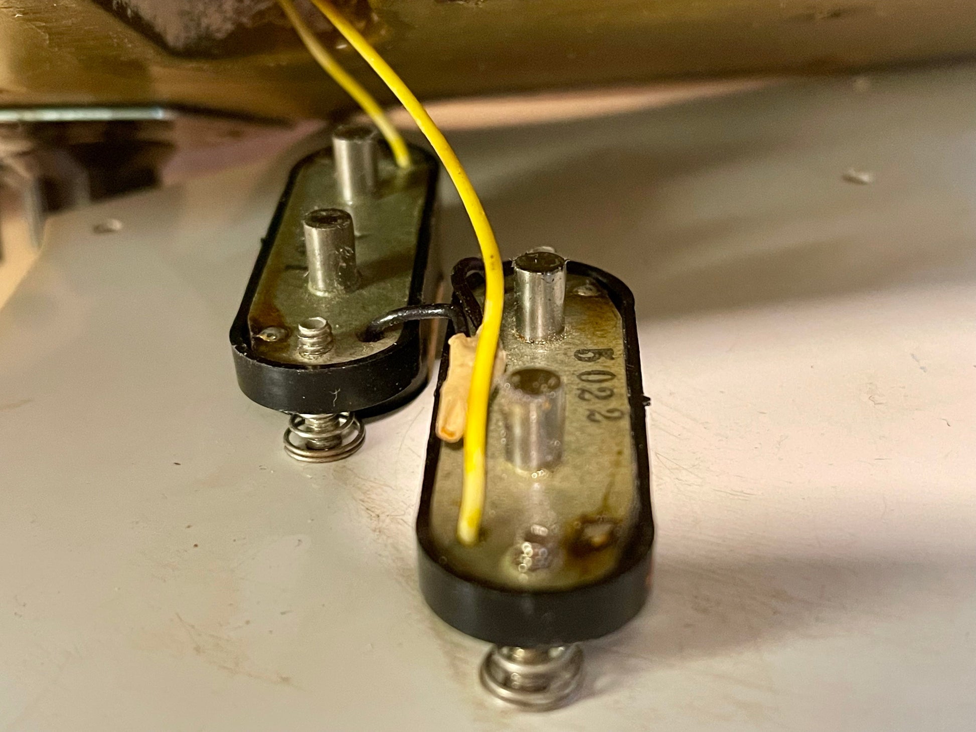 The original grey bobbin pickups have an excellent signal and measures 9.54 ohms. The controls all function smoothly and quietly. The potentiometers date to the 10th week of 1971. The bridge is functional. The aged repro pickguard is nice and flat and looks perfect.