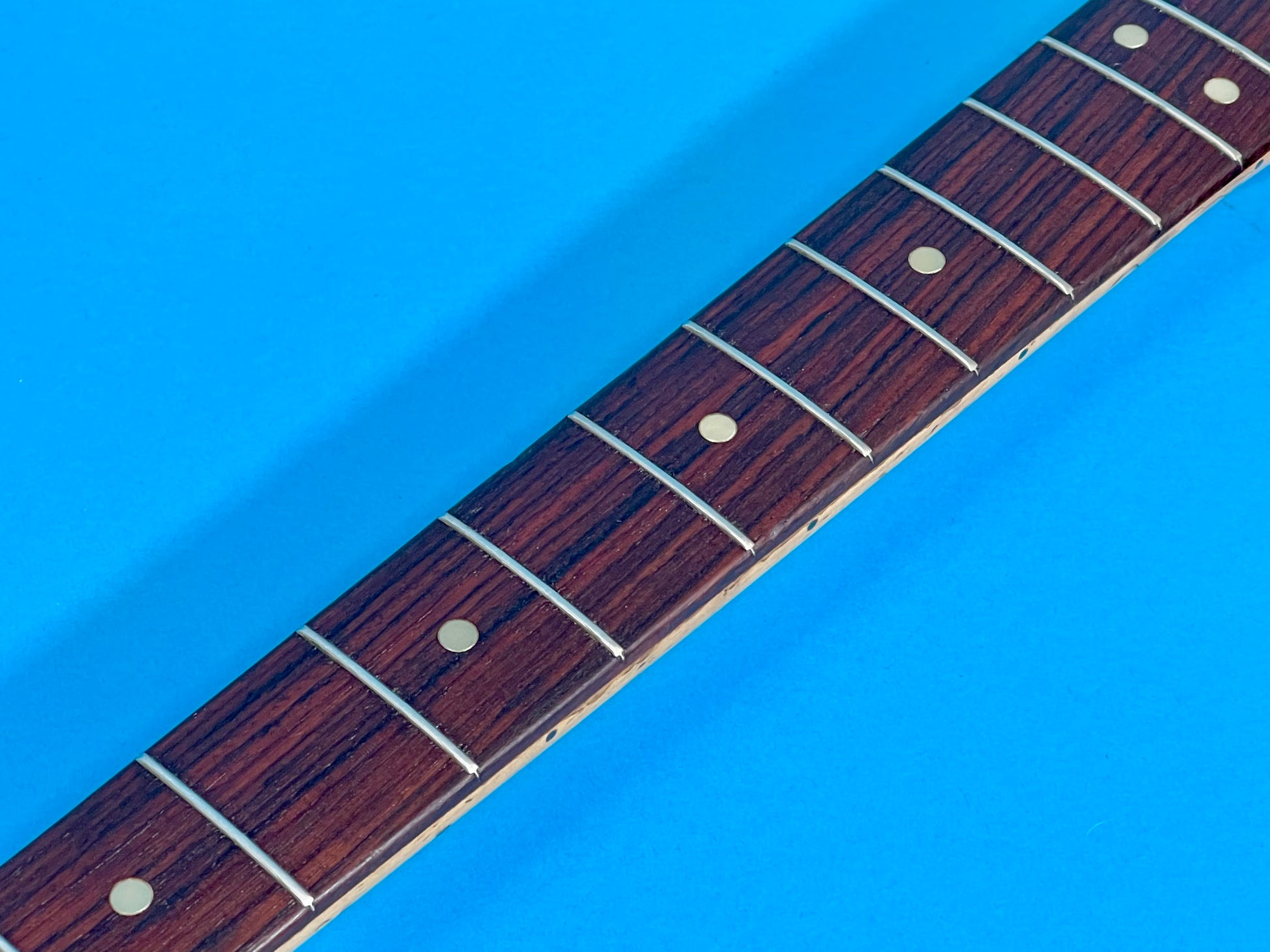 The body wears its 3-color sunburst finish with gusto! There is wear all over the body and neck also. See photos for details...The neck joint is solid and a great fitment. The neck itself is straight and smooth. There are pecks here all over the body and backside of the neck. The neck has a nice broken in feel. The nut measures 1.58" wide. The neck depth measures .858" at the 1st fret and 1.020" at the 12th fret. The tuners all function. The headstock and logo display awesome with tons of vintage flavor. The rosewood fingerboard is clean and the original frets are nice and bright with a crisp flat top and no low spots. As much as this bass was handled, the fingerboard and frets were very well cared for over the years. The action is low and the bass guitar plays like butter. It is so smooth and easy to play. The action is low, and the string height measures .010" at the 1st fret and .060" at the 12th fret.