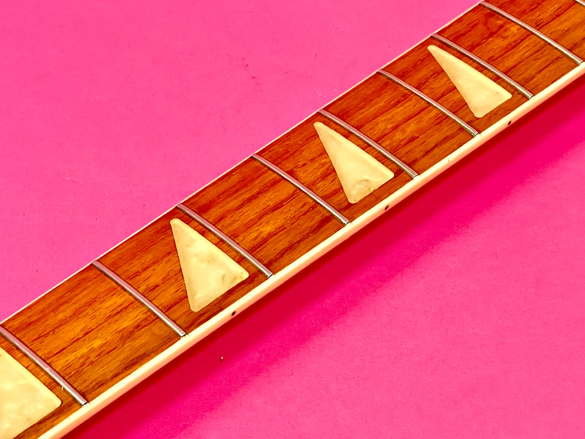The neck itself is of course straight and smooth. The neck profile is a typical vintage C-shape and measures 1.69" wide at the nut. The neck depth measures .919" deep at the 1st fret and .922" at the 12th fret. The original Grover tuners all function smoothly and the bass holds tune perfectly. The headstock and logo display excellent. The rosewood fretboard is clean and shiny and the distinctive cursed pearled triangle position markers look killer. The frets have been professionally dressed: leveled, crowned and polished and appear like new condition with excellent height. The bass has always had flat wound strings on it, and does so now. The action is low and the bass plays easily with a light touch. The string height is .010" at the 1st fret and .075" at the 12th fret. Of course you can raise or lower the height with the bridge if you should choose to. The bass plays great up and down the fingerboard with zero dead spots... plays like butter.