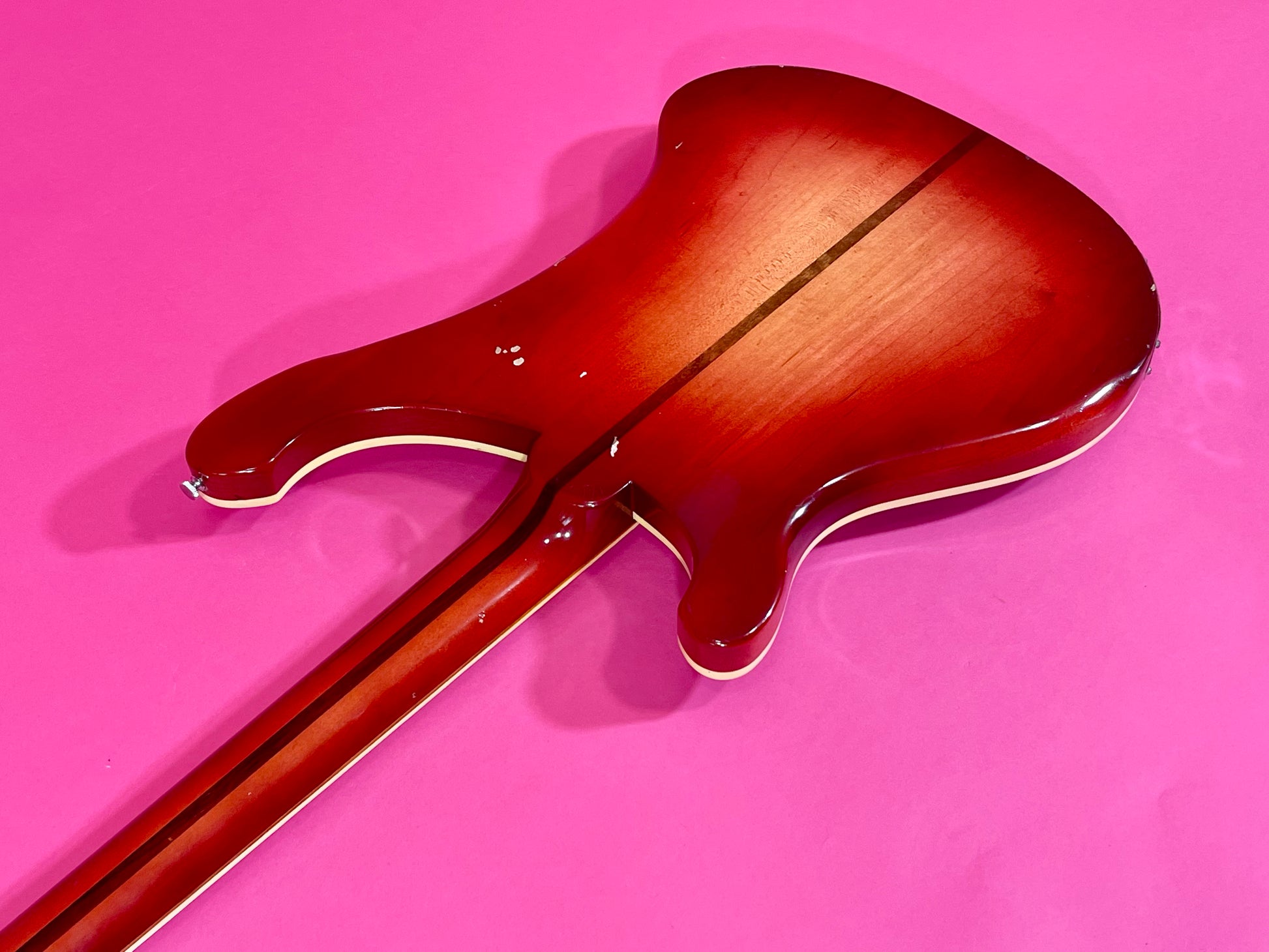 The body is clean and crisp with various signs of light handling-see photos. The finish is nice and bright and dare I say it glows? You get the idea. The red is strong and bright-looks killer. The binding is clean, as is the pickguard. The chrome hardware displays a slight amount of patina that adds to the vintage vibe nicely. The Bass is a neck-through design, meaning the neck extends all of the way through the body for superior resonance and sustain. The neck angle is therefore-excellent.