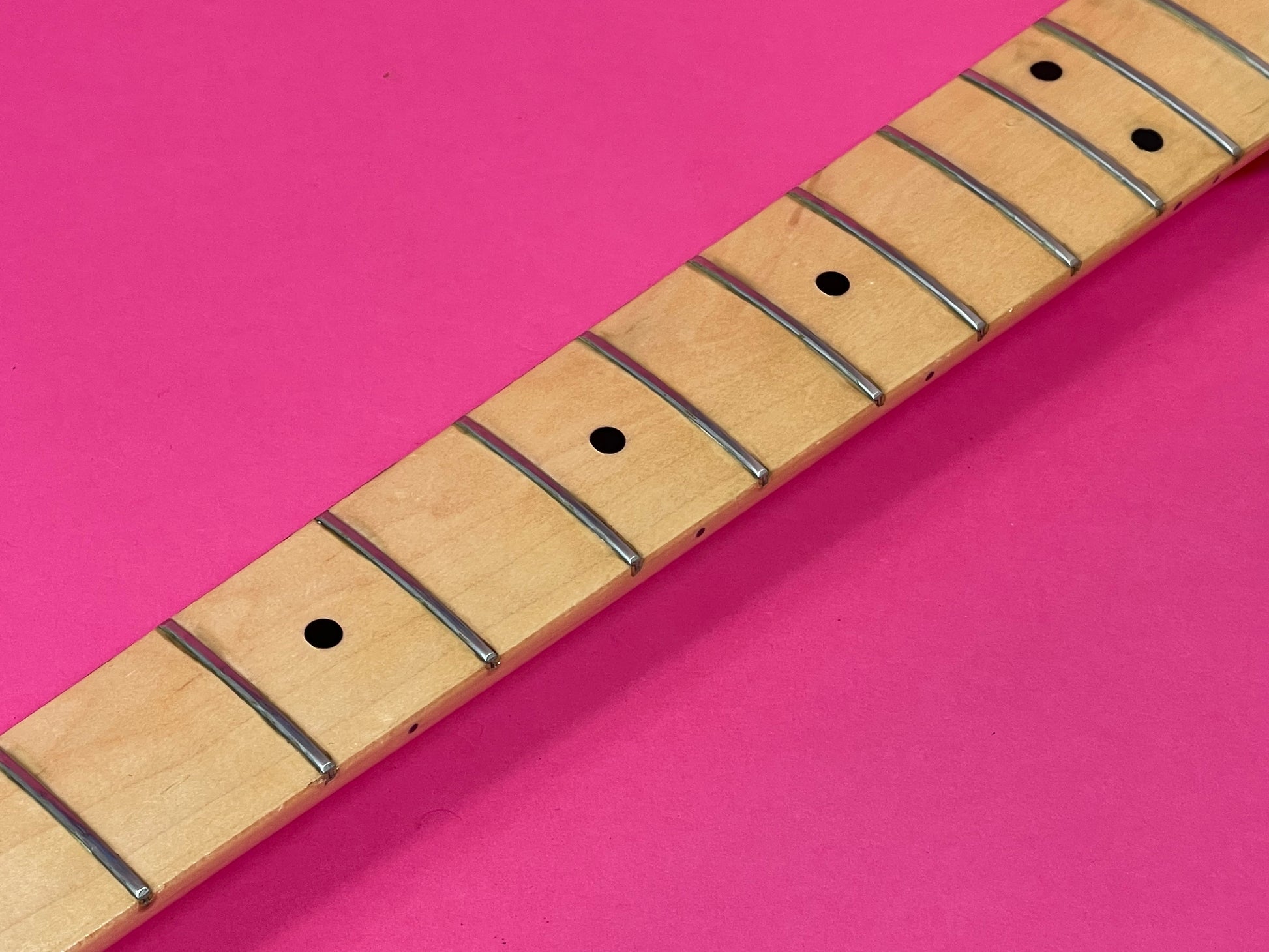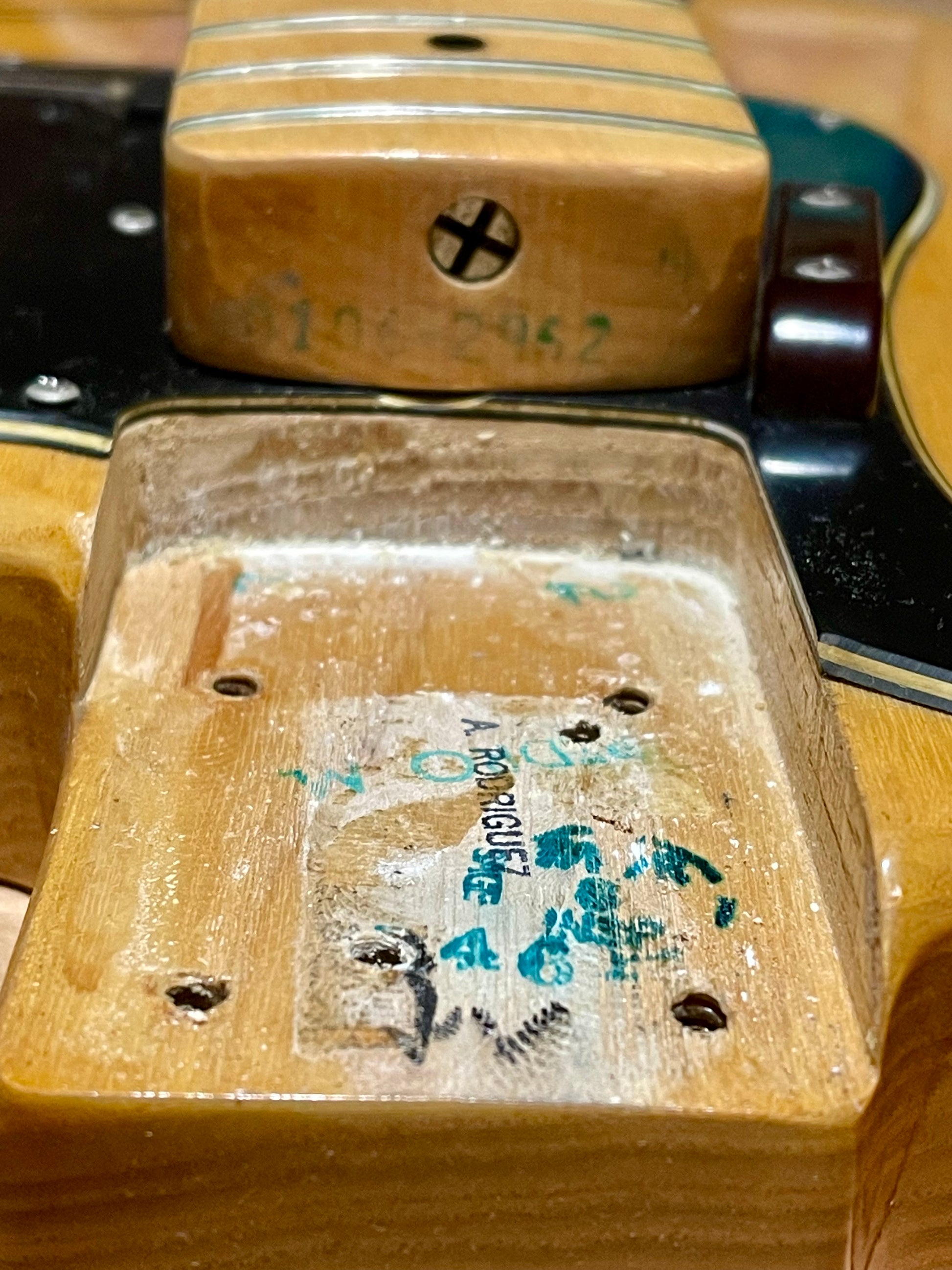 The body is super clean with crisp lines and nice contours. The finish is clean and with a nice gloss. The woodgrain has a beautiful contrast and the Bird's-Eye figuring on the front and back is really cool-see photos. There is a touch of line checking on the backside-visible only at certain angles and it is really cool looking-see photos. The clear finish is very clean and glows nicely. The neck joint is an excellent fitment. In the neck slot there a couple of Fender employees' inspection stamps and two names: Sage & A. Rodriguez which are both well-known in the vintage Fender employee nerd world.