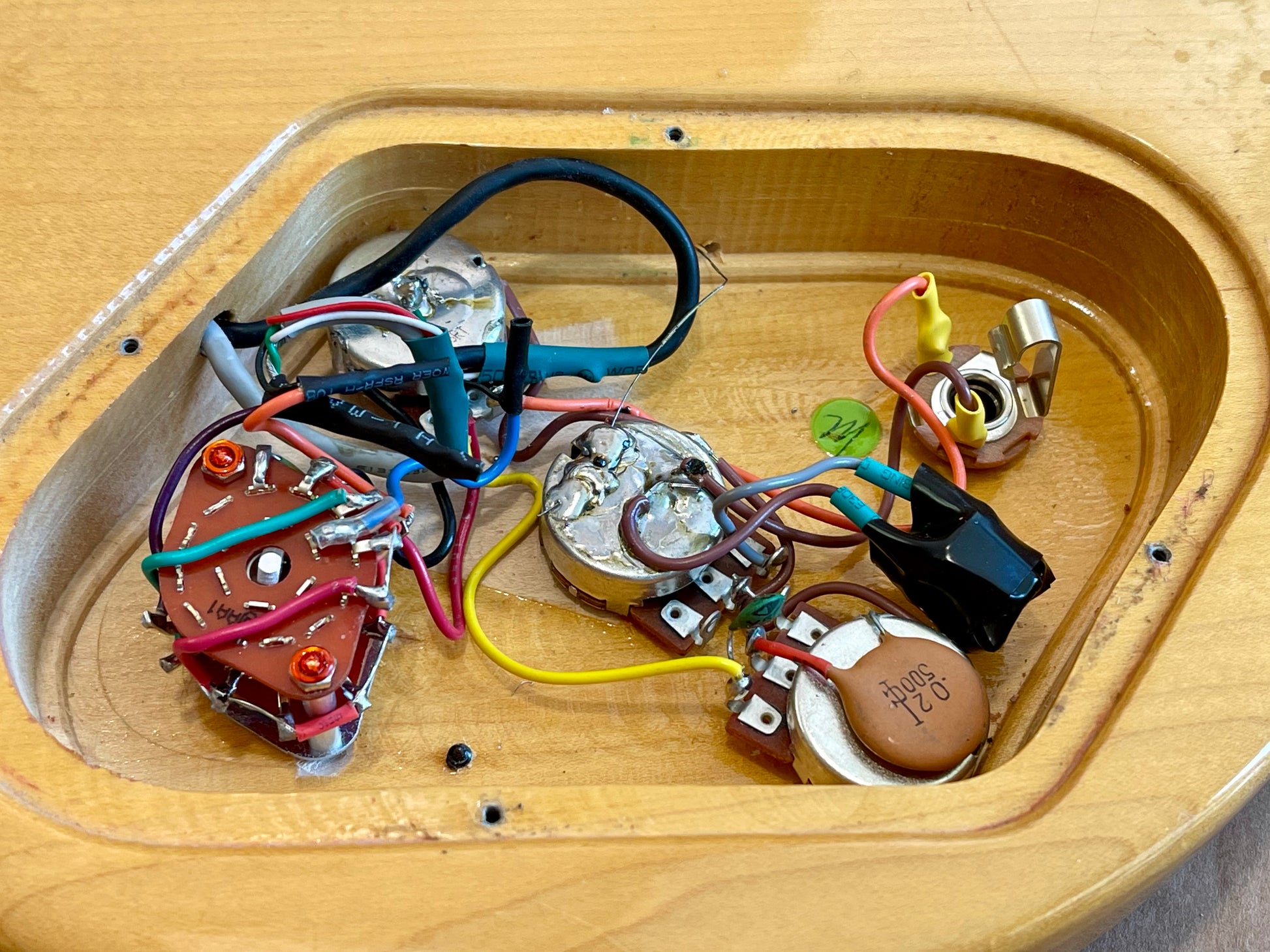 The pickups are aftermarket PAF-style humbuckers and they both have a good strong signal-the neck measures 10.07 ohms and the bridge position measures 14.26 ohms. The electronics all appear to be new and the wiring was done nicely. The rotary switch selects pickup combinations in the following configuration: neck-neck/bridge-bridge-neck mod-bridge mod. I believe the mod modes are some sort of coil tap. The 3 potentiometers are volume, bass and treble. The bridge is the original harmonica piece and the stop tailpiece is clean and functional as well.