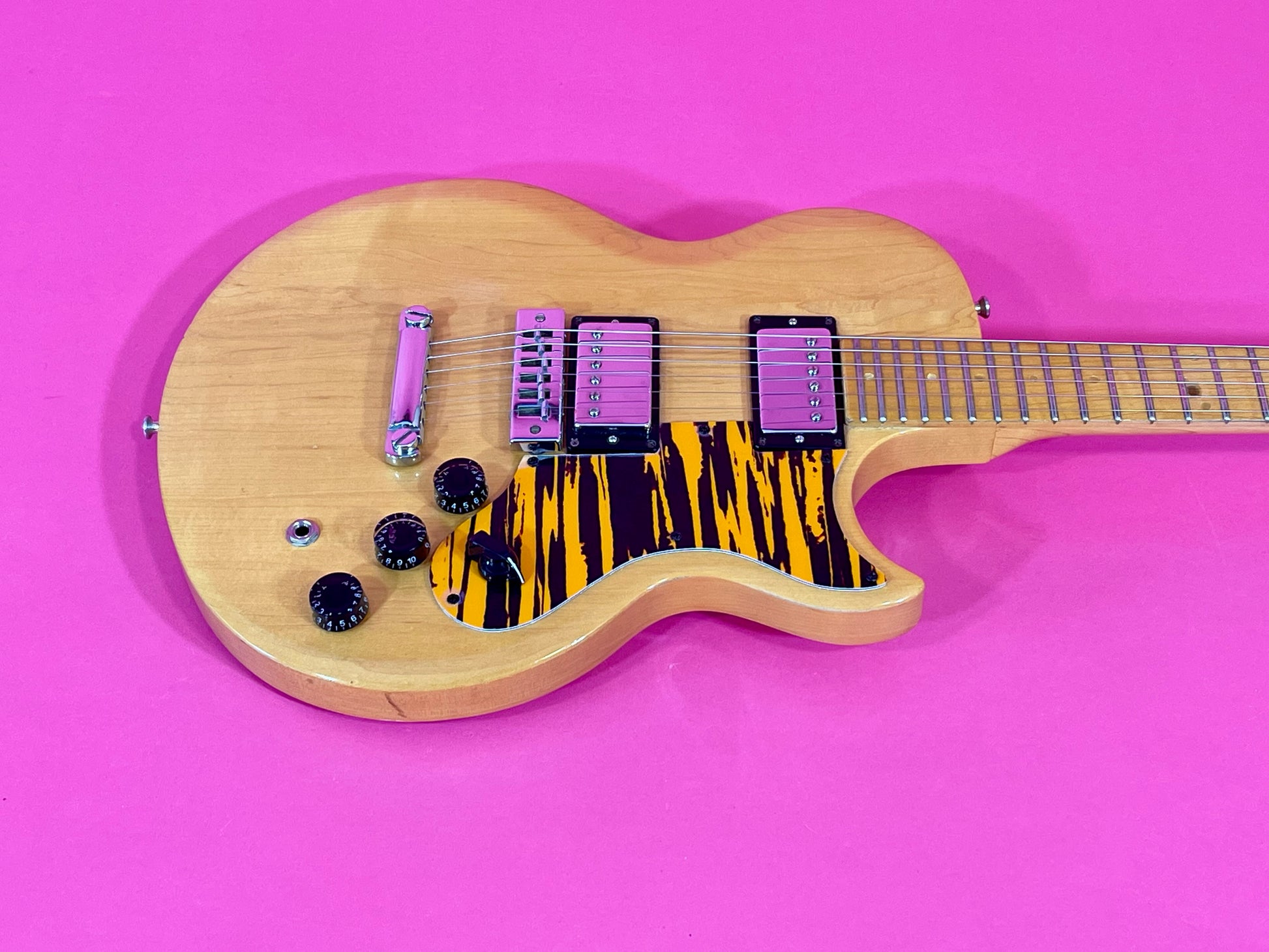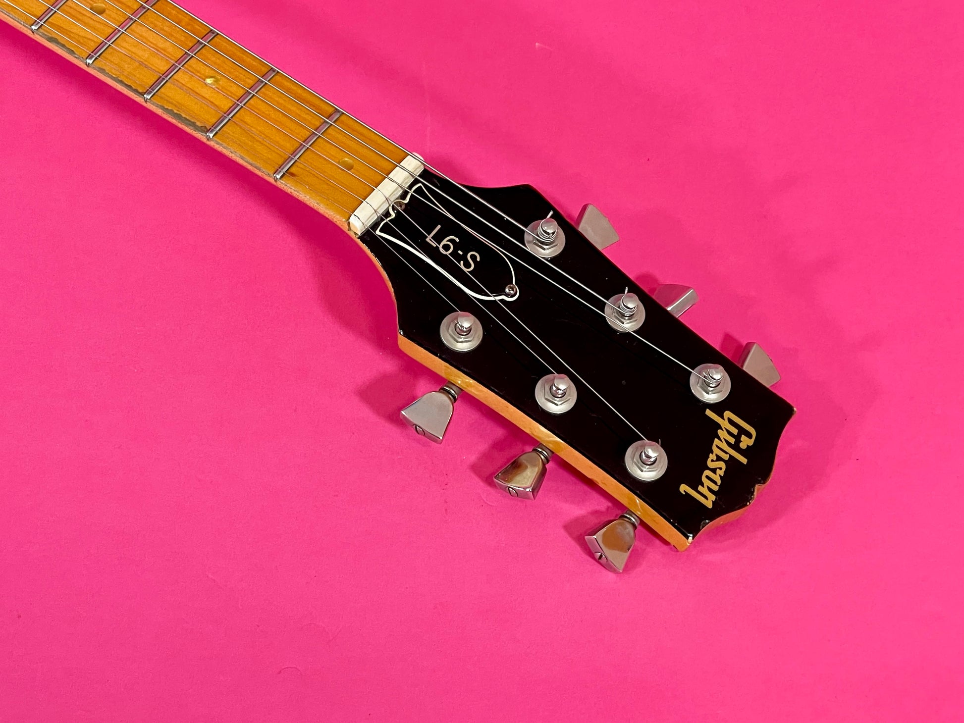 This vintage Gibson L6-S Custom model was made in 1976 at the original Gibson factory in Kalamazoo Michigan, U.S.A. It has the 3-piece maple body with 3-piece maple neck and a set-neck construction. The guitar is solid and plays and sounds great. The big news is that Tiger-Stripe pickguard! So hot.