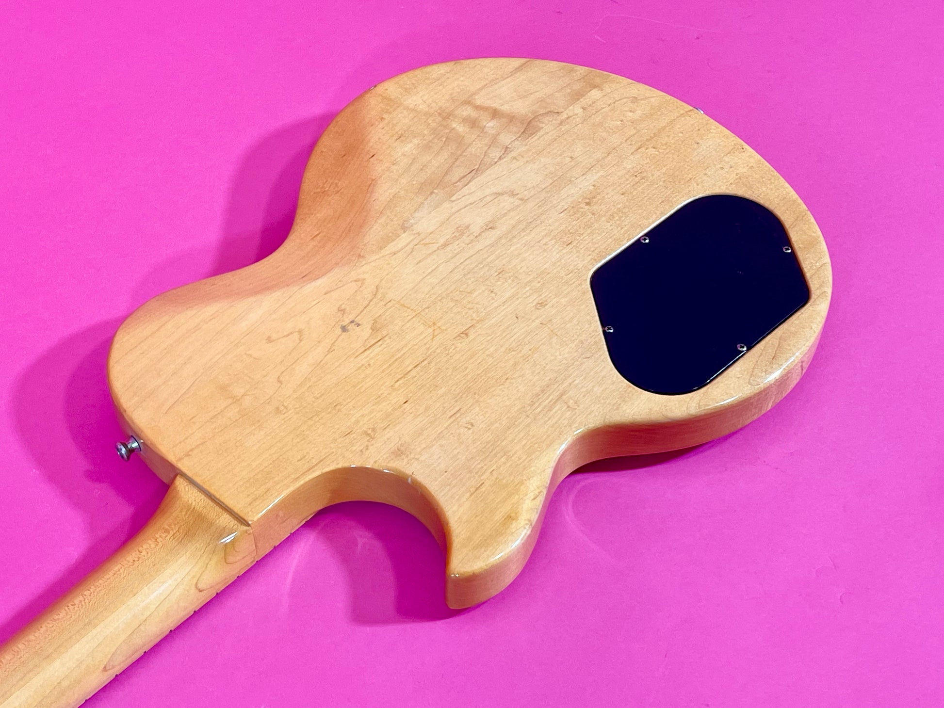 The guitar has a nice slim body with familiar Gibson cutaway profile. The maple body has a woodgrain that is nicely defined and has lots of interesting patterns. The clear coat finish is in very good condition and has a nice vintage shine. The pickguard is aftermarket and looks killer. The original black pickguard is included (added mini-toggle hole) along with a repro-if you like the stock look.