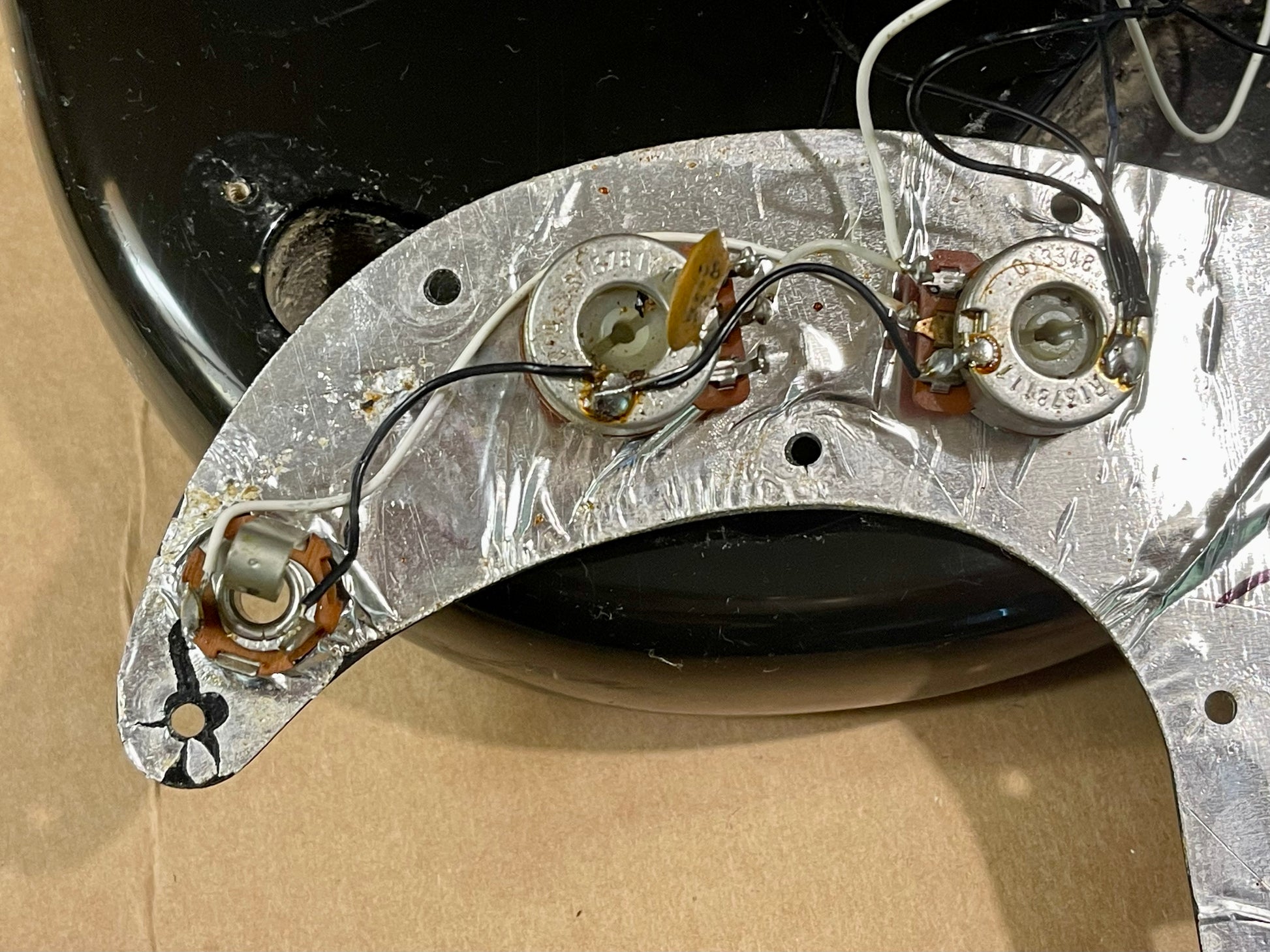 The body features the classic Precision Bass shape that has been the same since 1957. The front and rear contours are nice and crisp. The Black finish is glossy and deep and in very good condition. The pickguard is nice and flat with no cracks or issues. Both chrome guards are in place and add a nice touch of class. There is minor handling evidence here and there in the finish, overall the bass presents very nicely-see photos. The neck slot has various Fender inspection stamps and a serial number sticker that matches the neck decal. The serial number on the decals suggest a build date of 1979-but Fender over produced these decals for a couple of years in a row, so it is not uncommon to see earlier numbers on an instrument that was actually completed a couple of years later. This bass is a case in point. Everything is totally original, and the potentiometers date to early 1981-as you can see for yourself in the photos. So I would identify this as a 1981 and lots of people will tell you that it is a 1979 because of the serial number. At any rate, It does feature more appointments from 1979 than 1981 but I'm not going to worry either way.