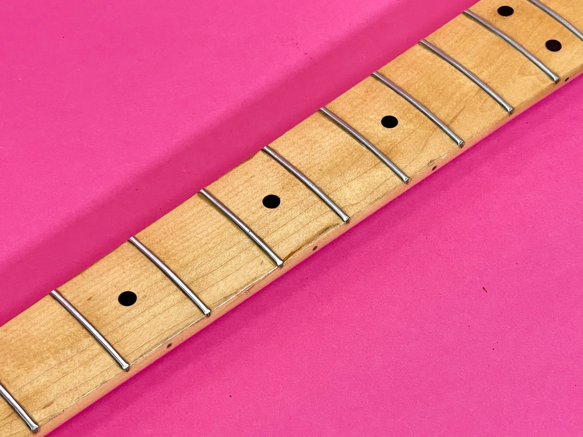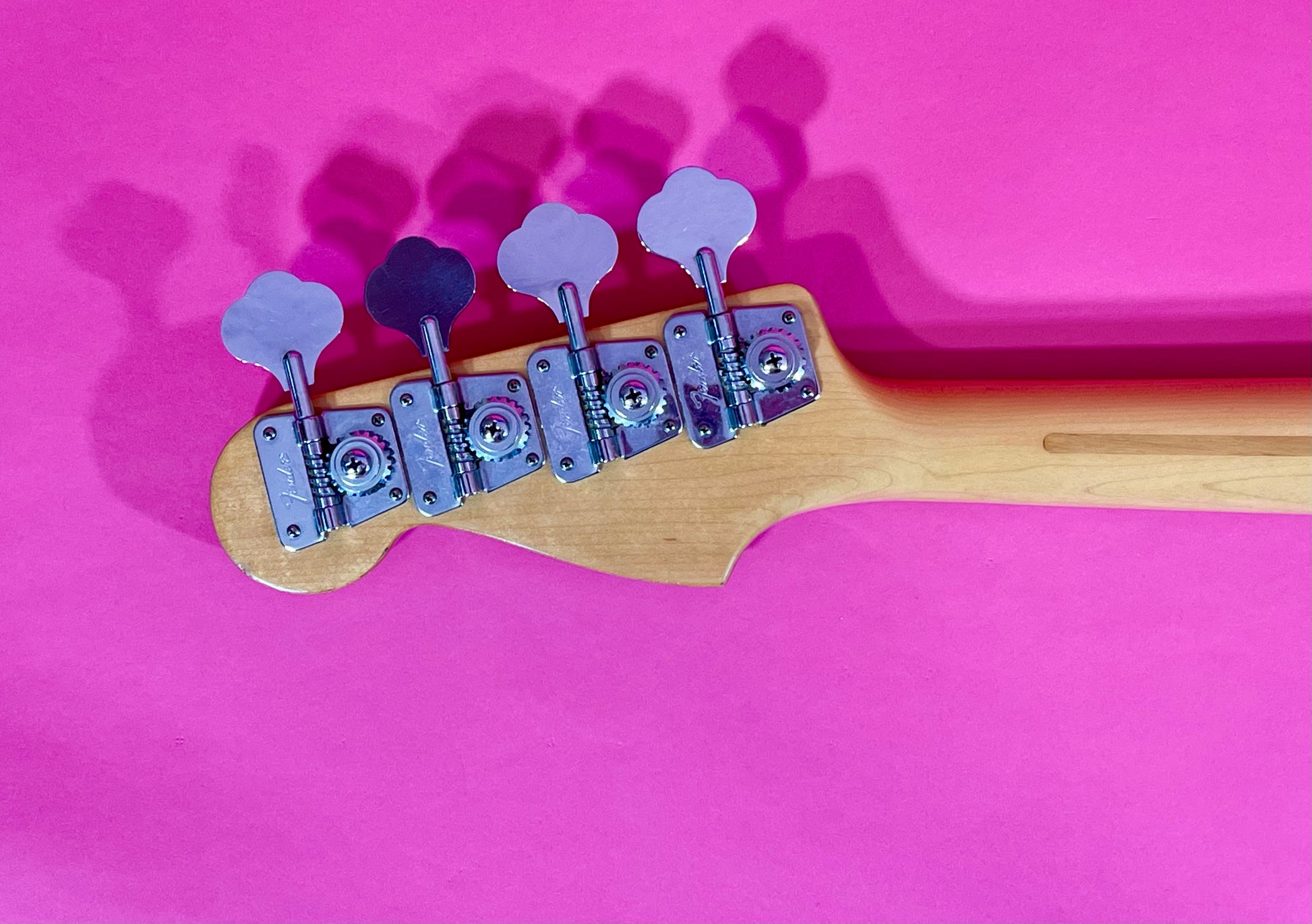 The neck itself is straight and smooth. The truss rod functions fine. The neck has the classic vintage C profile and feels great. The neck measures 1.66" wide at the nut-a bit wider than the typical P-Bass. It is close to 1 11/16" wide. The neck depth measures .871" deep at the 1st fret and .953" at the 12th fret. The tuners all function smoothly and the bass stays in tune excellent. The headstock and decal display excellent. There is some really cool line checking in the clear coat on the face of the headstock. This is the perfect kind of checking in the lacquer that is quintessential Vintage. The maple fingerboard is squeaky clean. The frets have been professionally leveled crowned and polished and appear crisp and bright-see photos. The action is fairly low and the bass plays like butter. The string height at the 1st fret is .010" and .050" at the12th fret. Of course the bridge is fully adjustable and you can easily raise the action if you prefer that. As it is, it plays with a very soft touch and is easy. It plays great up and down the fingerboard and has a good response everywhere with no dead spots whatsoever.
