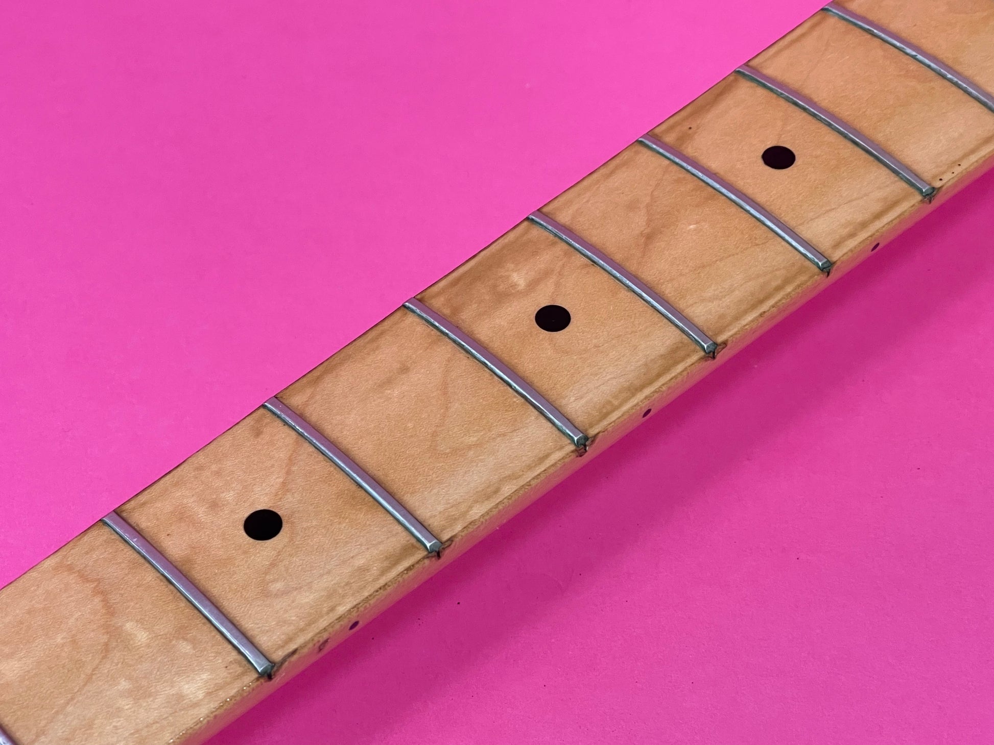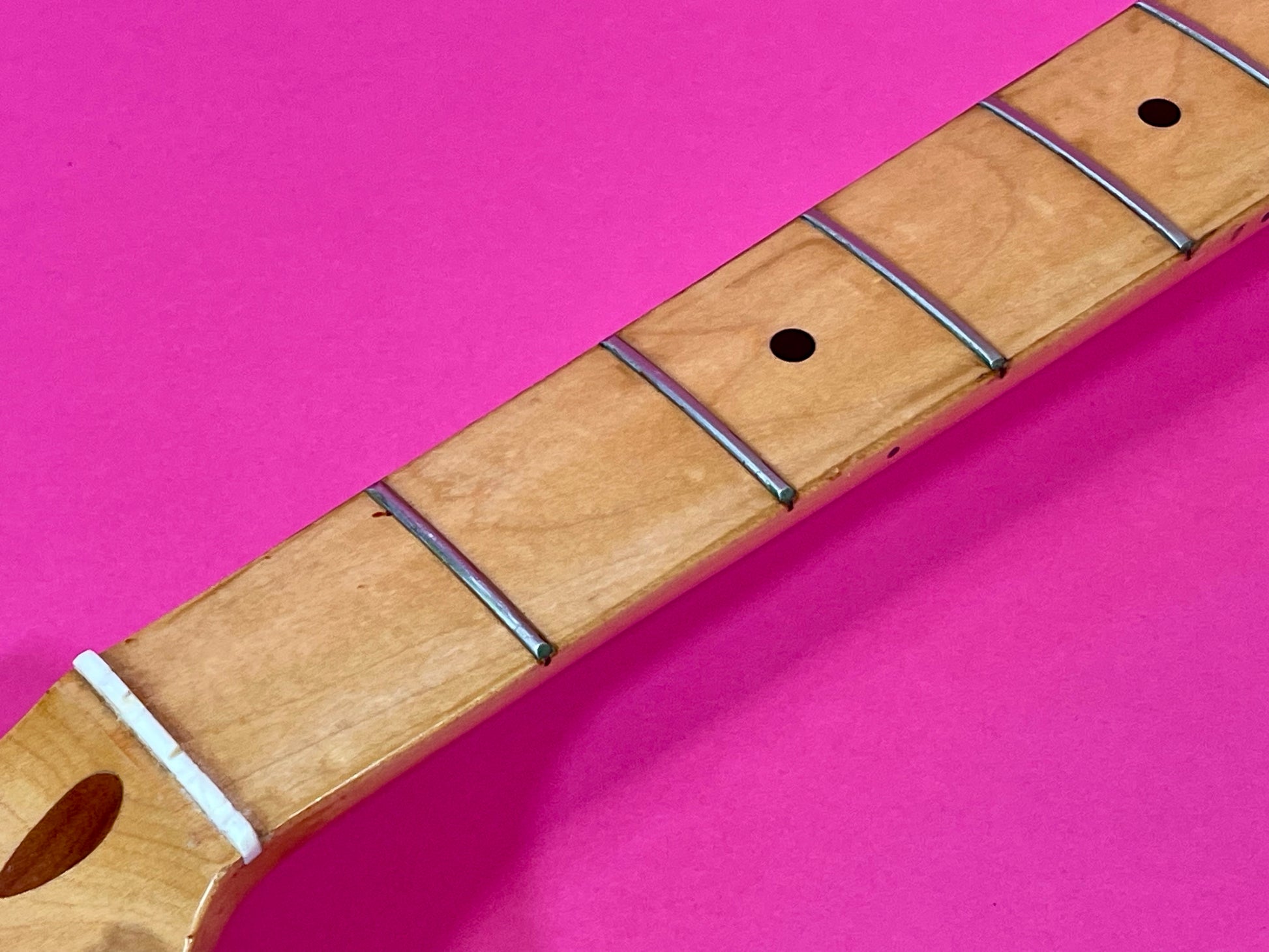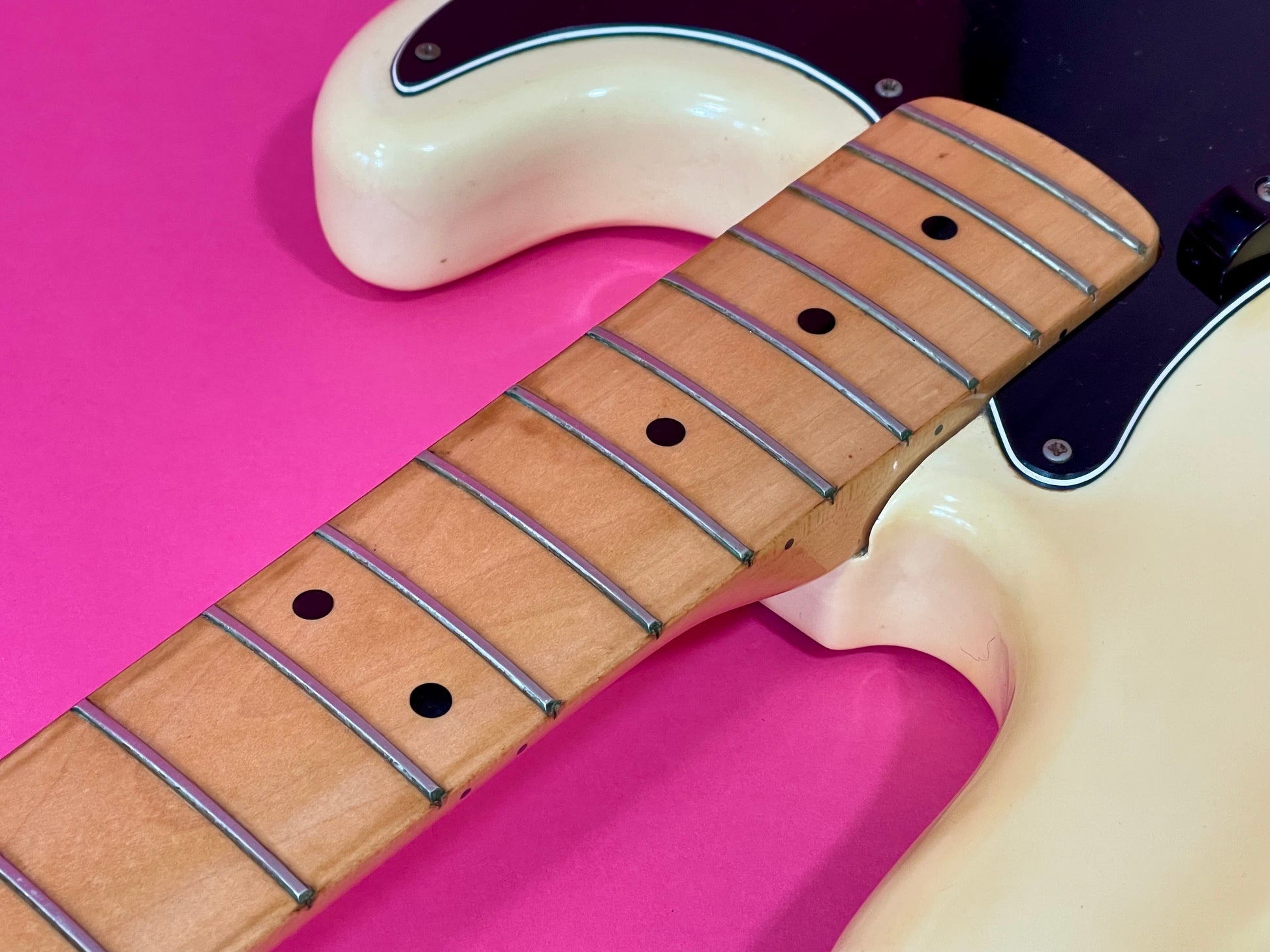 The neck itself is super straight with no issues. The profile is best described as the classic P-bass: a comfortable C-shape. The neck measures the standard size 1.63" wide at the nut (1 5/8") and the neck depth measures .867" deep at the 1st fret and .983" at the 12th fret. There has been some sort of work done to the nut, it appears that a couple of grooves were added for a narrower string spacing, but the strings are back in the proper spot now-see photos. The original tuning keys turn smoothly and the bass stays in tune. The tuners are in excellent condition. The headstock and logo both display excellent. The serial number suggests a 1978 model year, but Fender overproduced the 1978 serial decals (some say they are duplicates) and used them on guitars through 1980. At any rate, it is definitely original and original to the body as well. The maple fingerboard is clean and the frets have been cleaned up and appear very nice-close to new condition as the original owner used flat wounds (thanks, original owner). The action is nice and low and the bass plays great with a light touch. The string height currently measures .010" at the 1st fret and .095" at the 12th fret. You can adjust the bridge up or down if you wish.