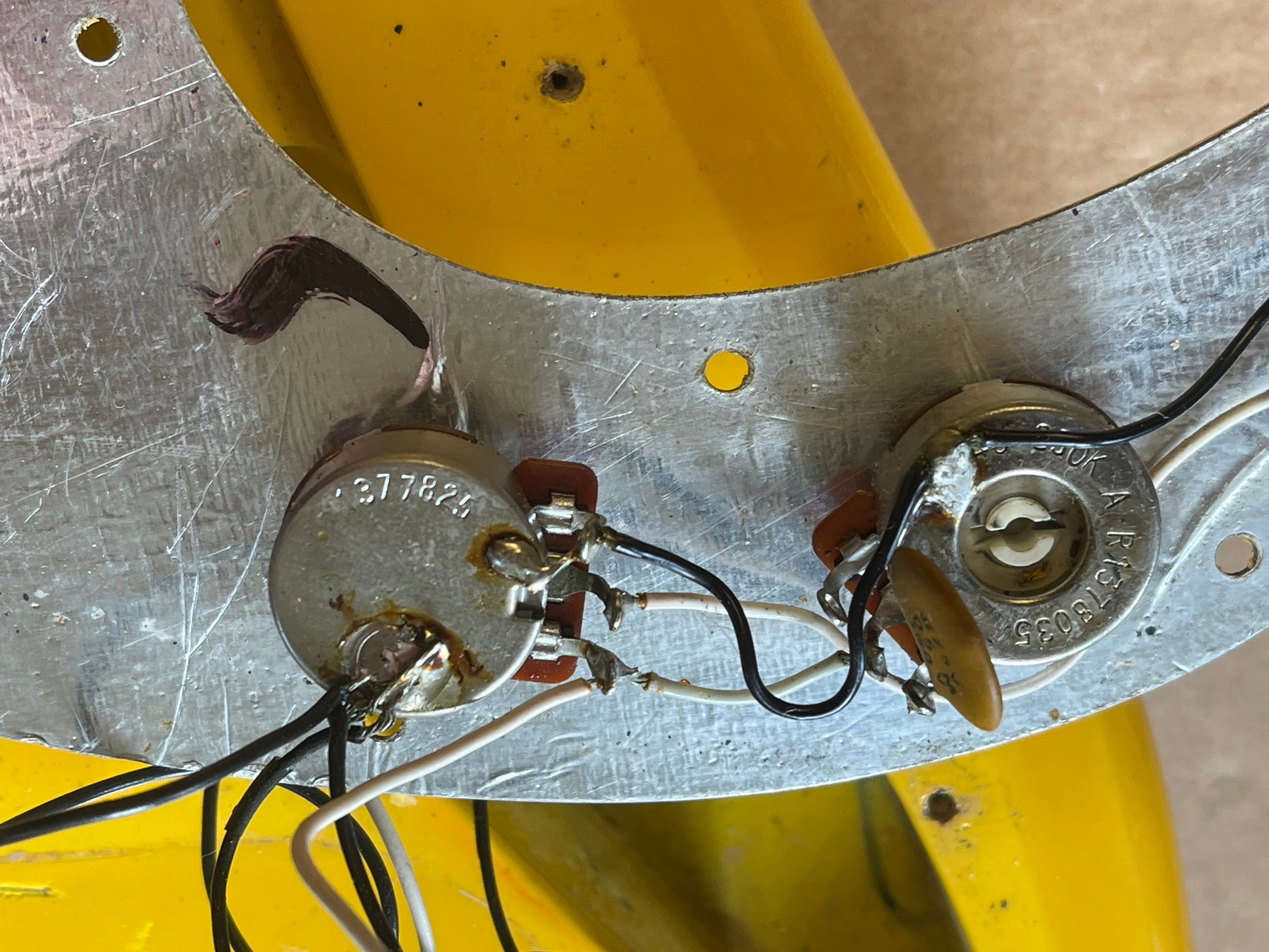 The pickups have an excellent signal and measures 20.29 ohms through the circuit. The circuit is in excellent condition and the controls function smoothly and quietly. The potentiometers date to the 25th week of 1978 and the 35th week of 1980 and the solder joints between them are original. The pickguard is nice and flat and the original finger-rest is present. The tone is quintessential Precision Bass: smooth highs and a thick and full low end rumble that only a Fender Bass can seem to deliver. The bridge show some patina but everything functions nicely.