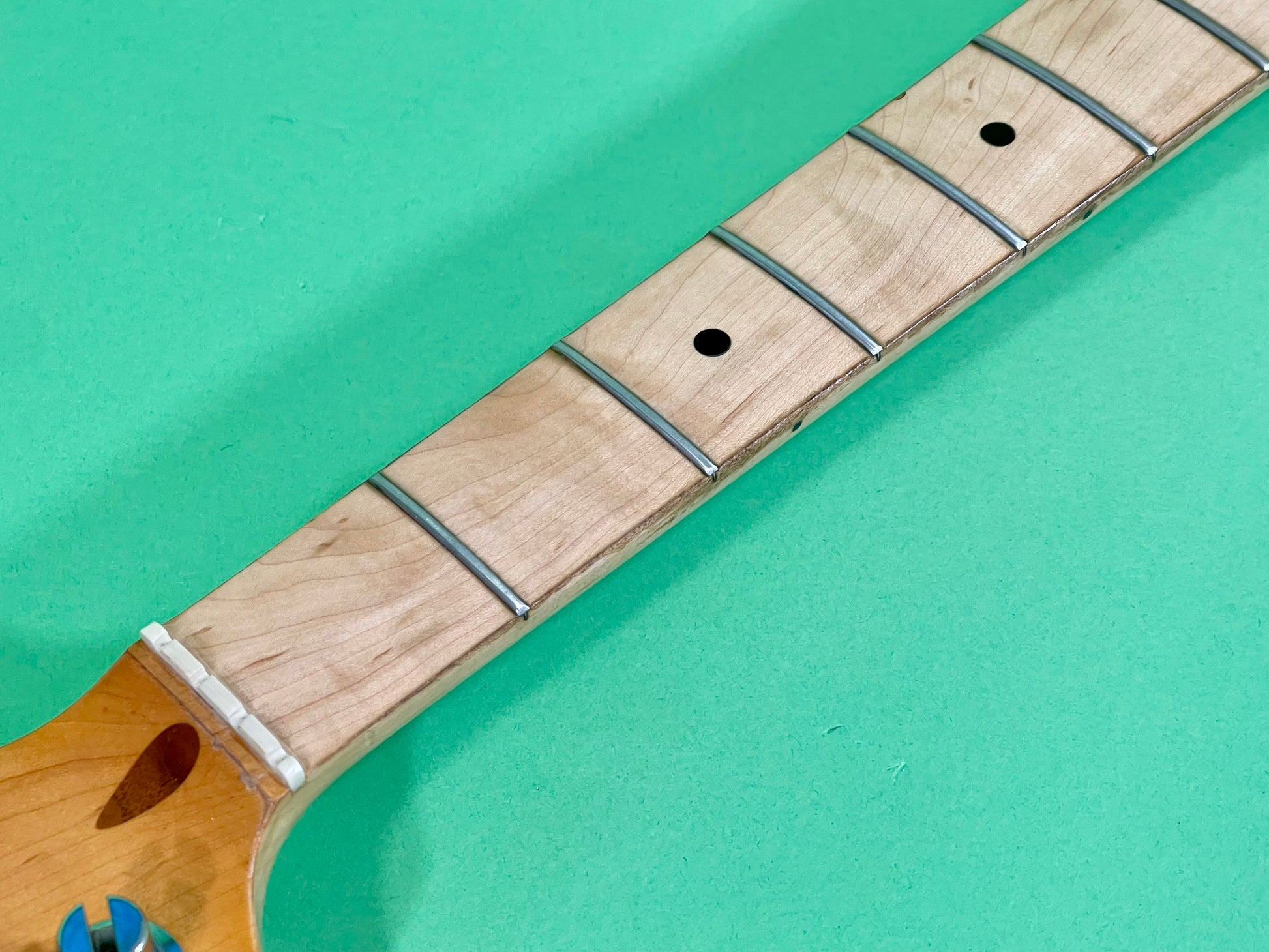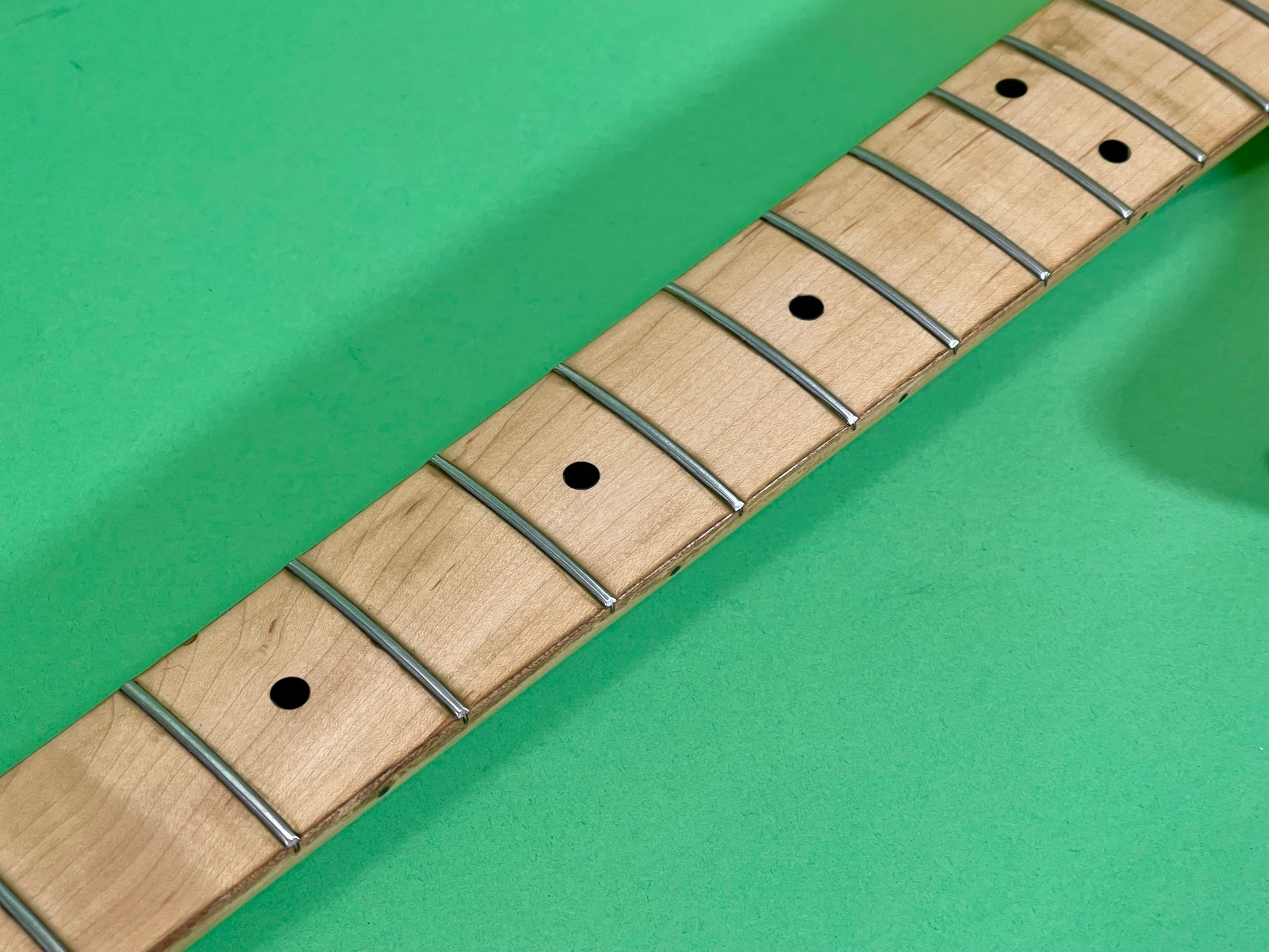 The neck itself is smooth and straight. Truss rod functions smooth and everything looks nice. The neck profile is the standard Precision Bass vintage C shape. The nut measures 1.63" wide. The neck girth measures .885" at the 1st fret and .960" deep at the 12th fret. The neck is very nice feeling and has that classic P-Bass feel. The tuners all function smoothly and the bass stays in tune perfectly. The headstock and logo both display excellent. The maple fingerboard is clean and very smooth-see photos. The frets have been professionally leveled, crowned, cleaned and polished, so they appear near-new condition-see photos. They are an excellent height. The action is set low for an easy playing experience. Currently, The string height is .010" at the 1st fret and .075" at the 12th fret. Of course, you can easily raise the strings with the adjustable saddles if you prefer a higher action. The bass plays like butter up and down the fingerboard. It feels smooth everywhere and the string spacing is excellent.