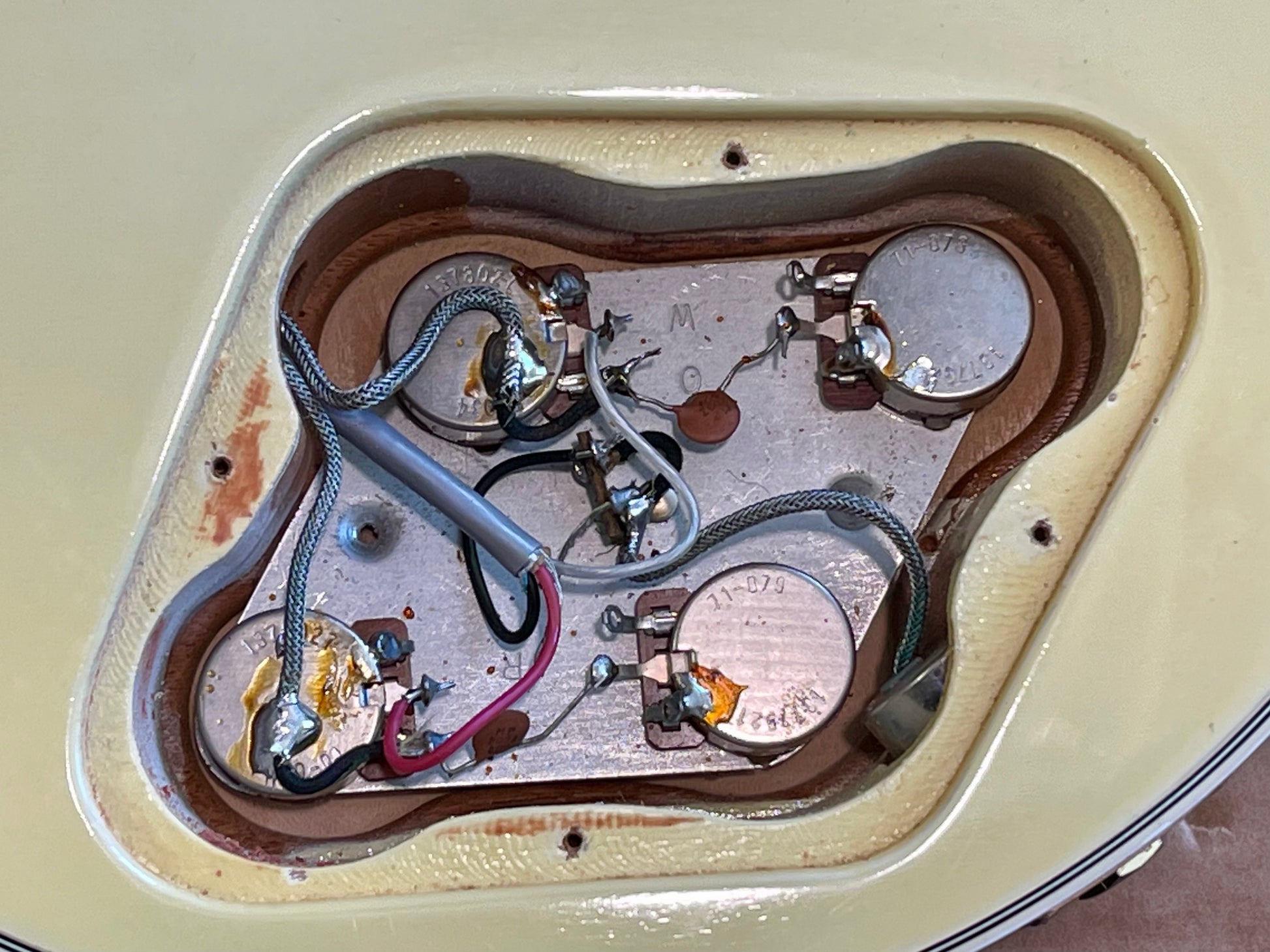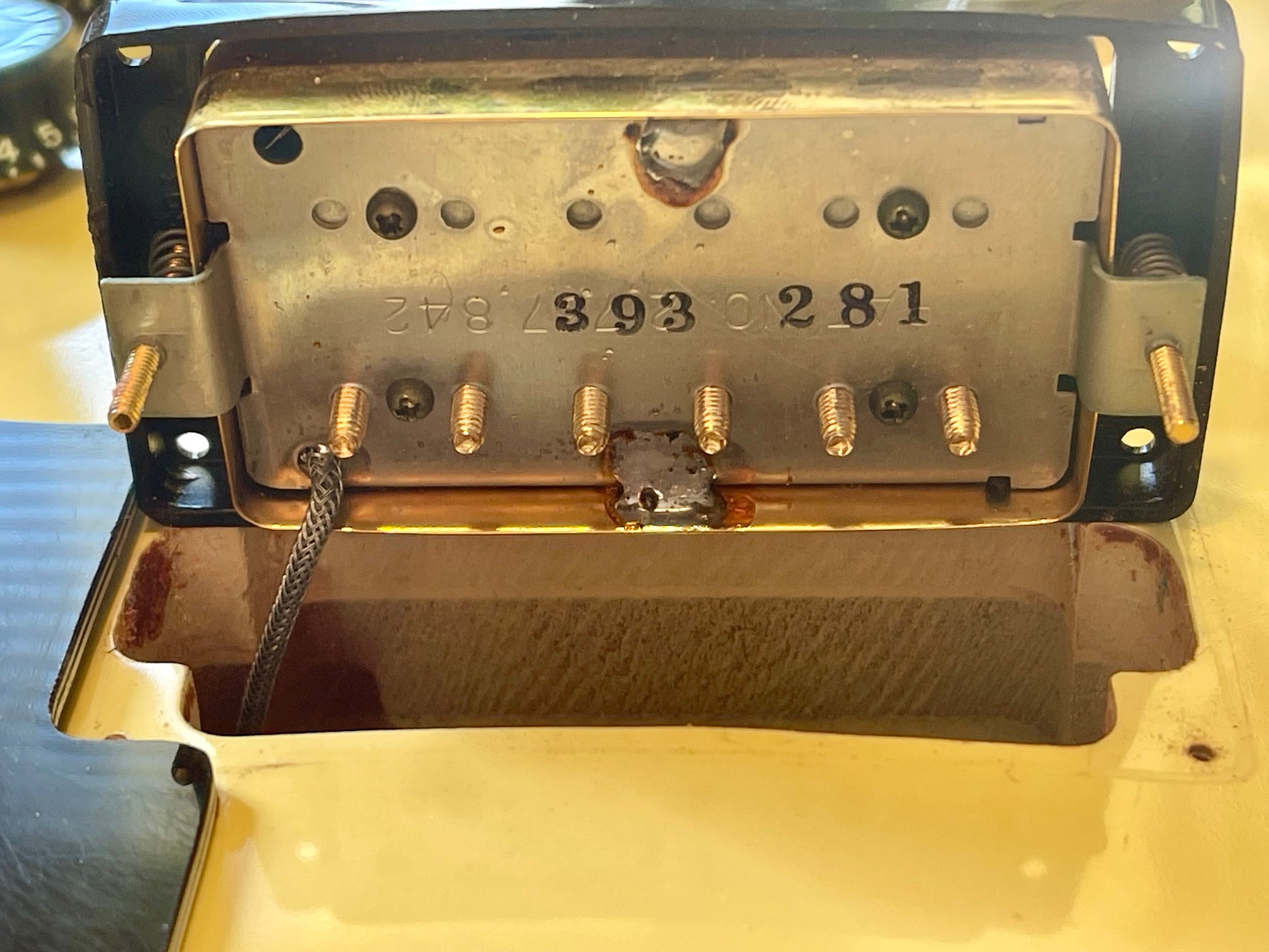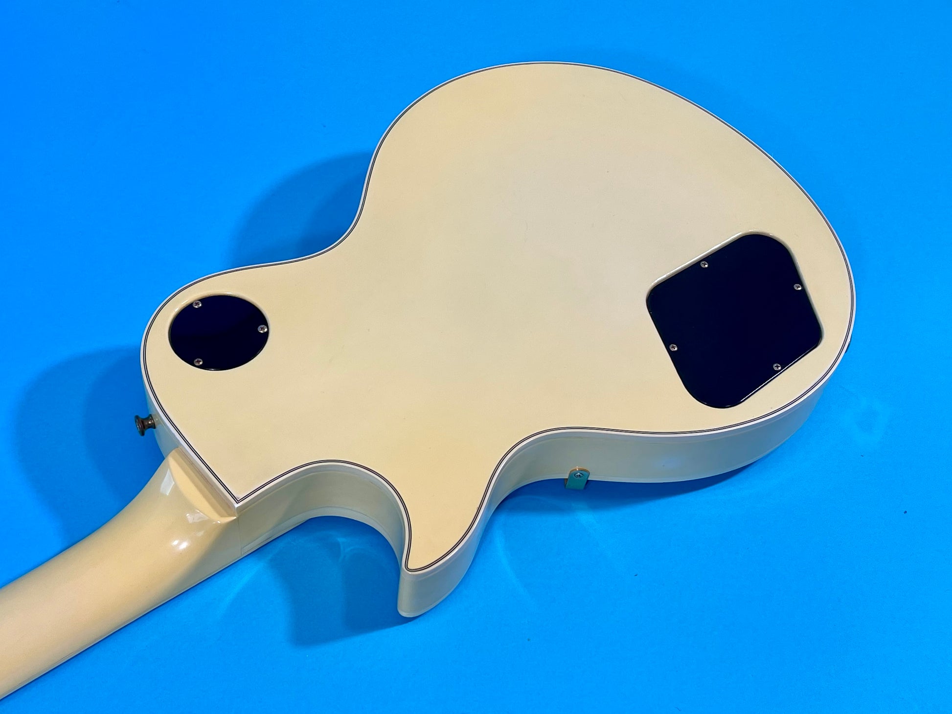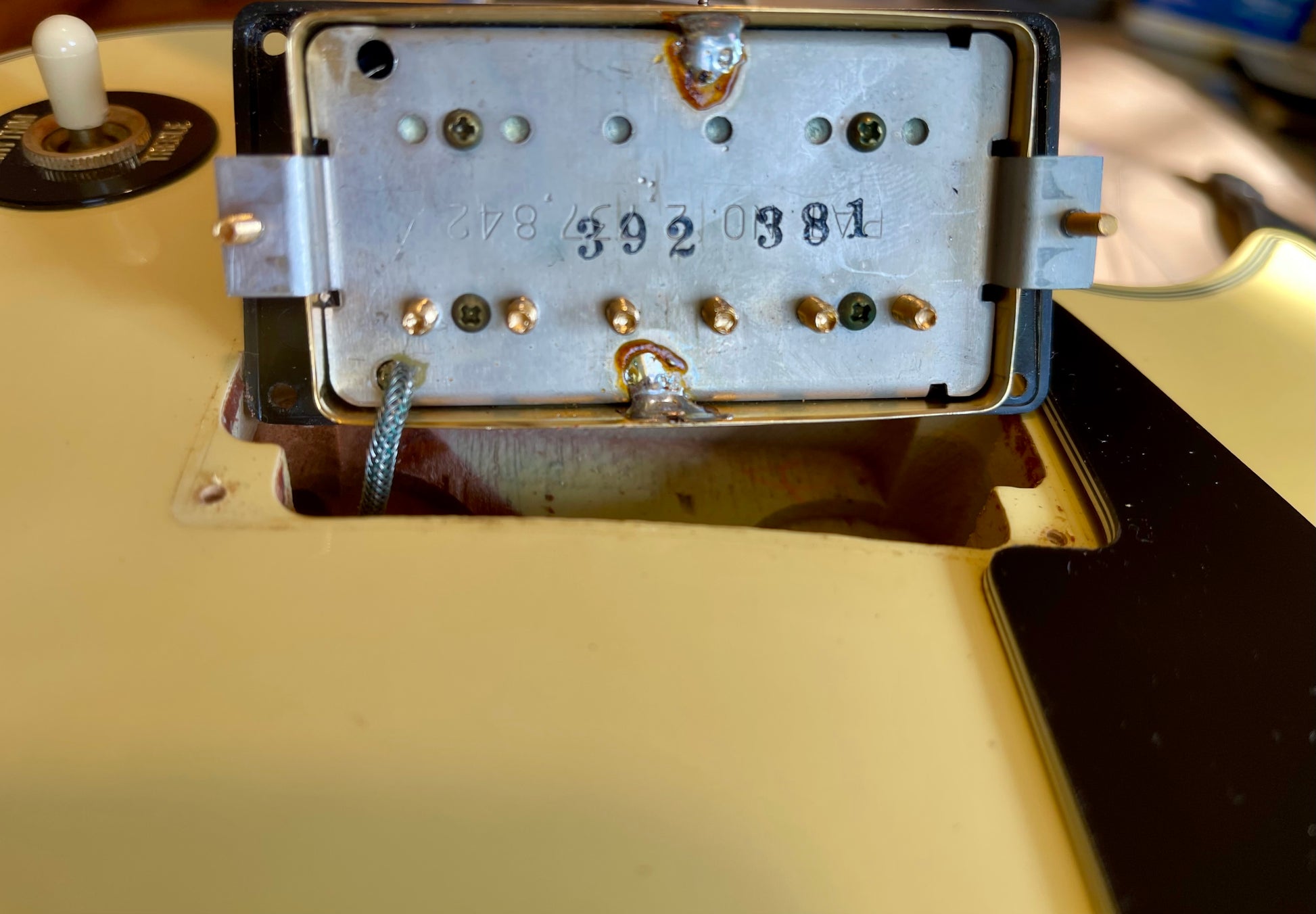 The pickups both have an excellent signal and balance extremely well. The neck output is 7.52 ohms and the bridge measures 7.40 ohms. The controls all function smoothly and quietly. The potentiometers date to 21st and 27th week of 1981. Pickguard is nice and flat-and the bracket is solid. Bridge and tailpiece are fully functional and clean. The tone is that unmistakable Les Paul Custom growl with incredible attack and richness.