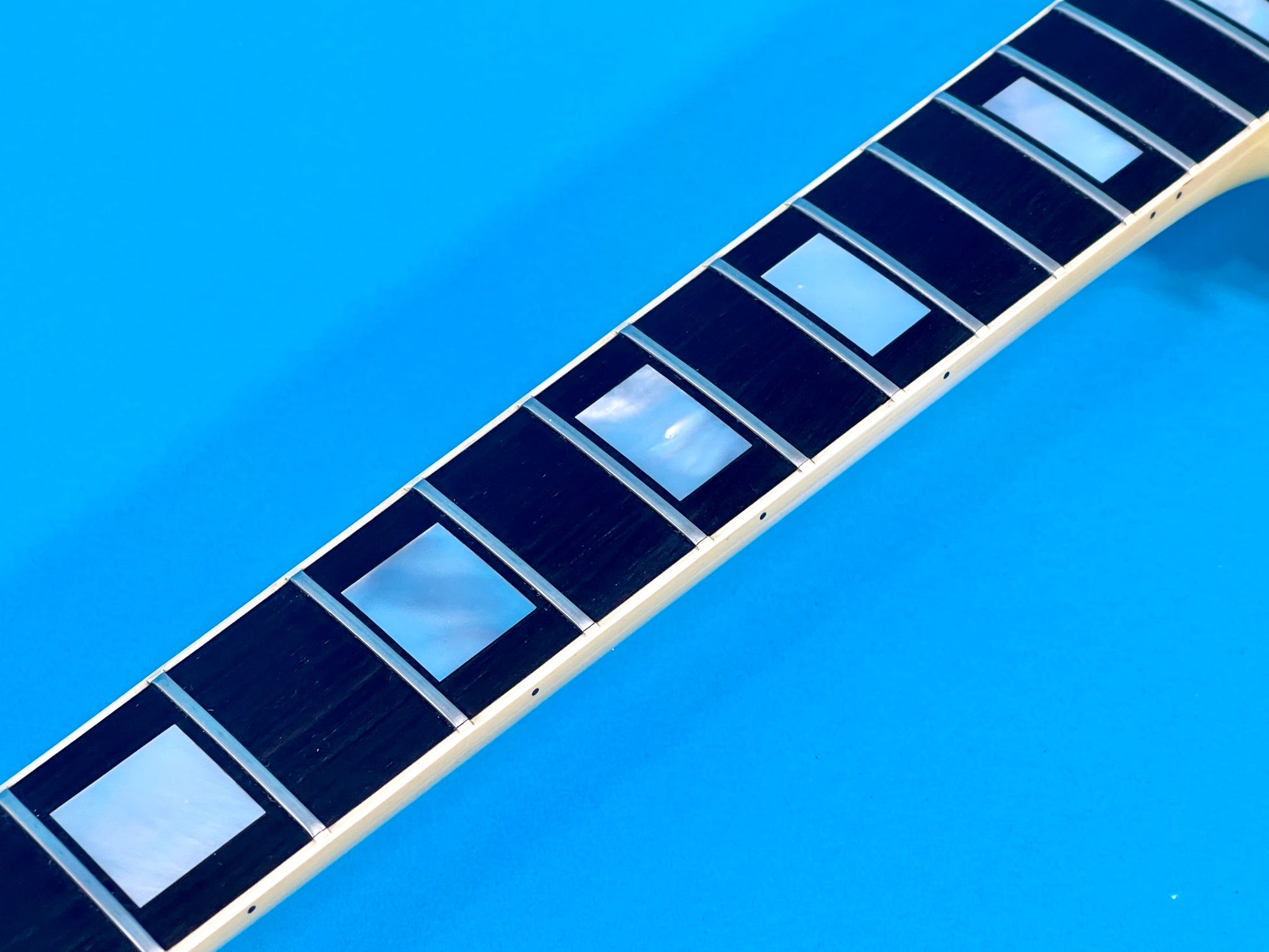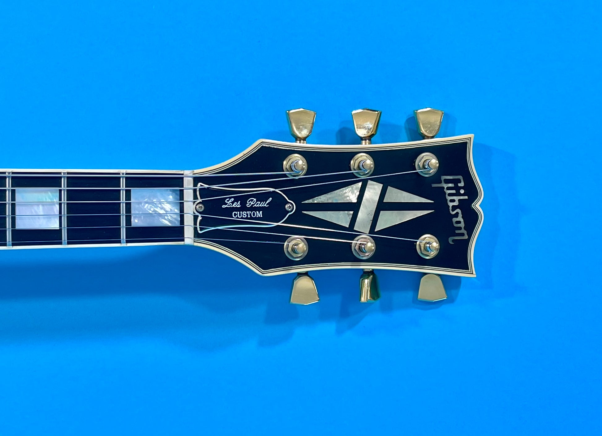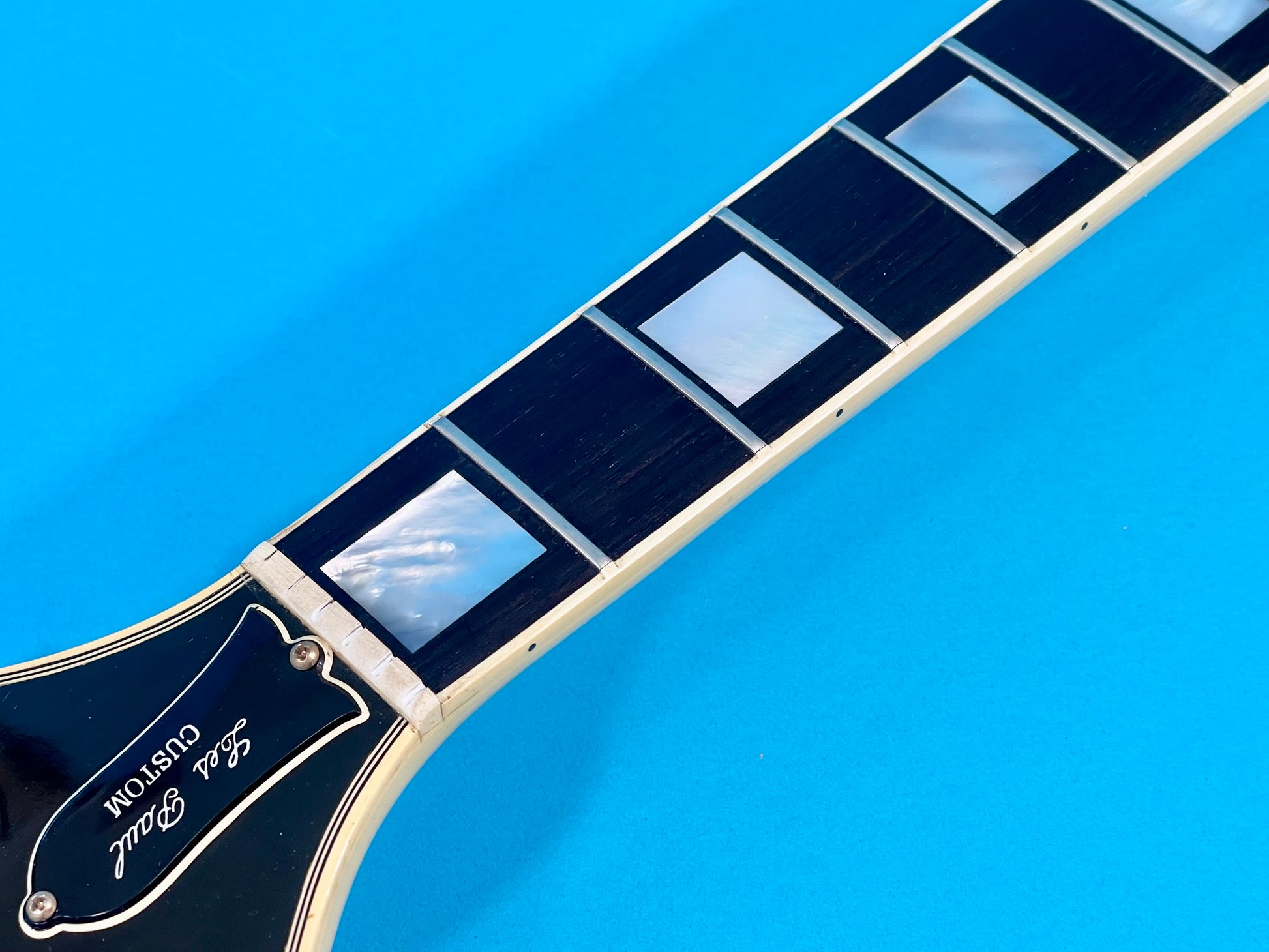 The neck itself is straight and very smooth. It has a medium thick slim-C profile. The nut width measures 1 11/16" wide at the nut. The neck depth measures .835" at the 1st fret and 1.030" at the 12th fret! It's totally killer. The binding is super clean throughout. The gold tuners function smoothly. The headstock and logo display excellent. The ebony fingerboard is clean and smooth as silk. The frets retain their nibs and look near new-condition-see photos. They are crisp and super clean. The action is low for an easy playing experience. The string height is .010" at the 1st fret and .040" at the 12th fret. This Custom plays like butter! It is one of the best players we've ever seen.