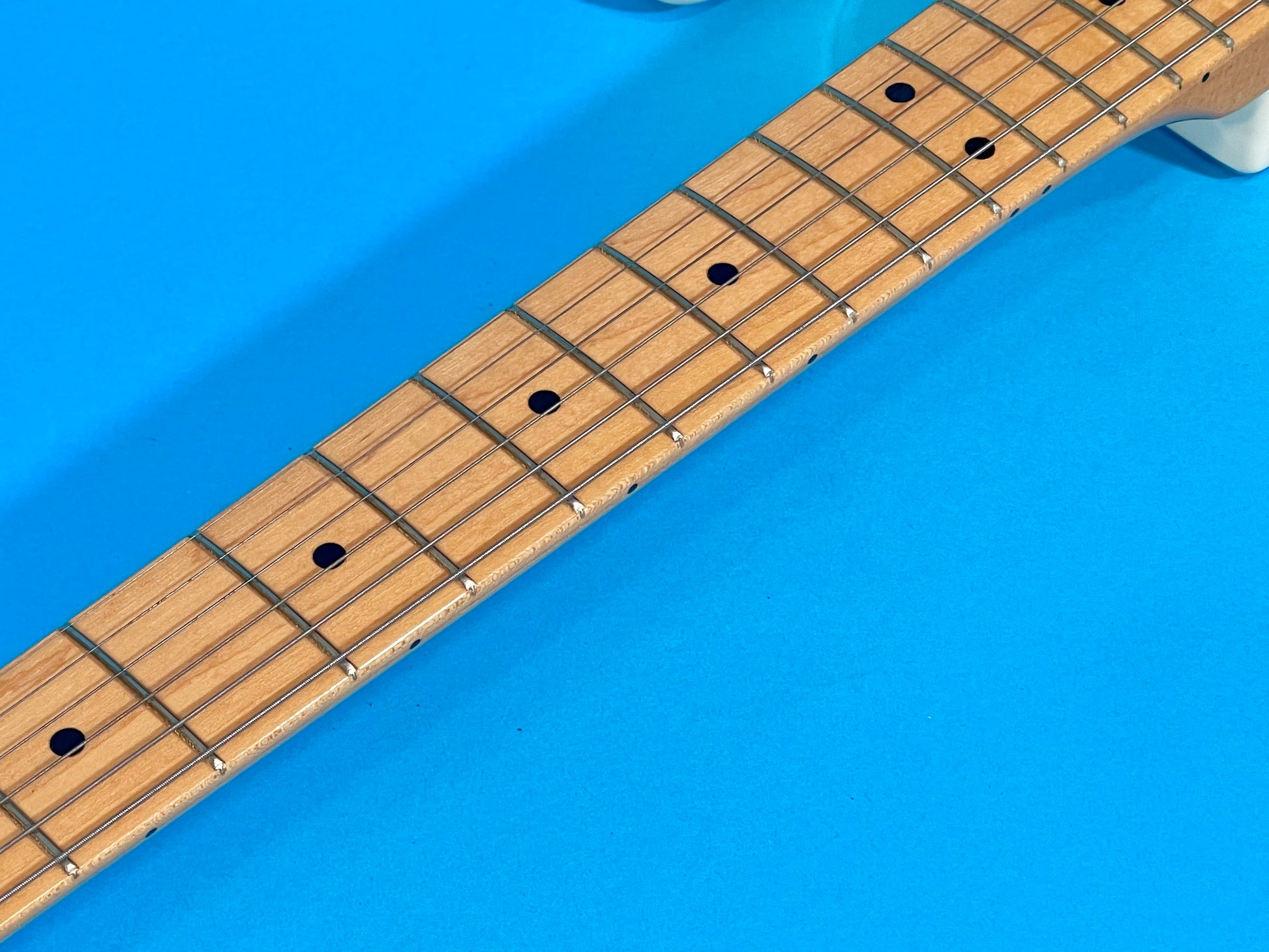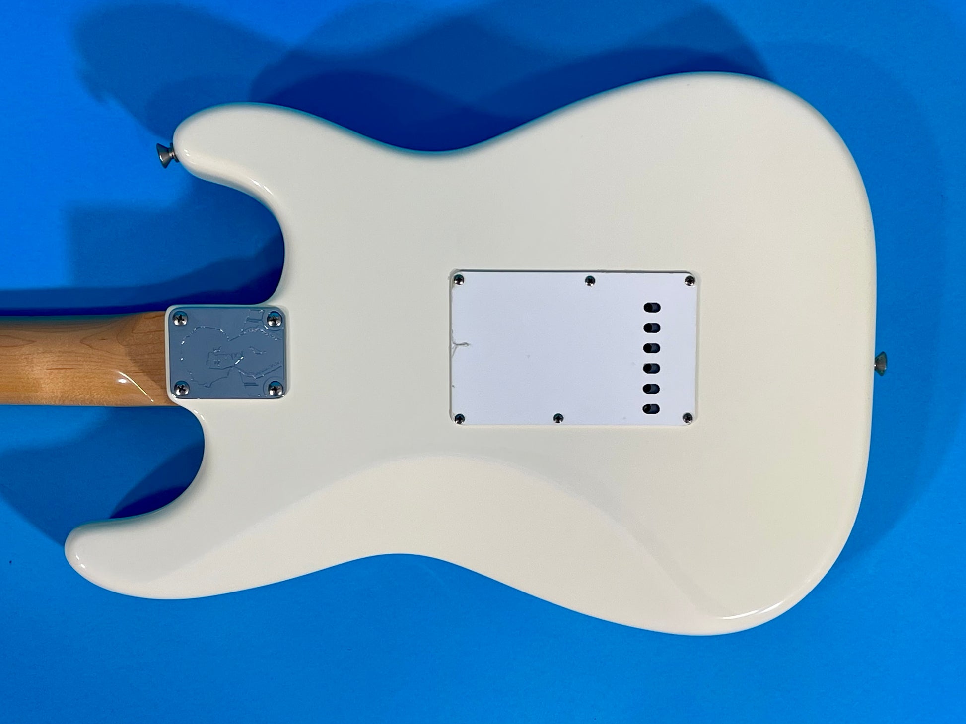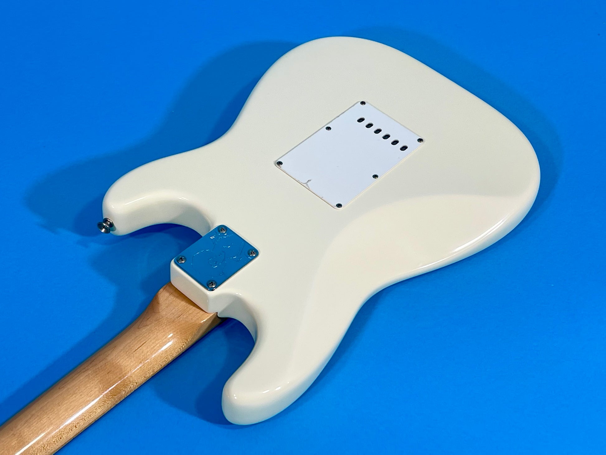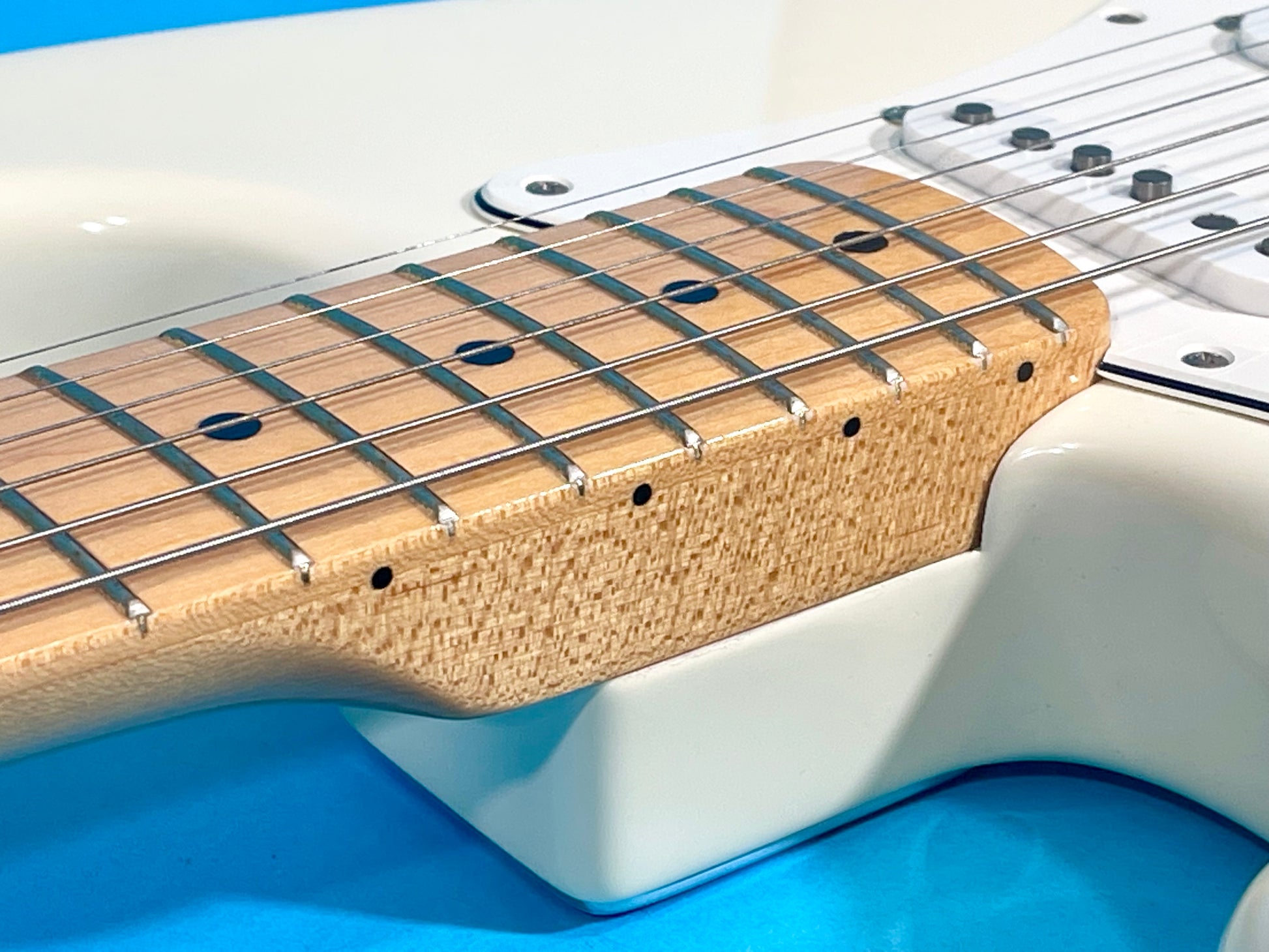 The body is super clean with deep contours front and rear. The Olympic white finish is glossy and looks absolutely killer. The neck plate is the special non-script Hendrix silhouette. The neck is straight and smooth and exceptionally clean. The neck profile is a typical vintage C shape and it feels amazing of course. The nut measures 1.68" (1 11/16") and the neck depth is .797" at the 1st fret and .915" deep at the 12th fret. The tuners all function smoothly. The headstock and reverse logo display awesome-flip your photo image and it looks like you're playing a real lefty. The Maple cap fingerboard is super clean. The frets are clean-maybe a little bit of whitening from just sitting around but near-new condition for sure. The action is low for a fast and easy playing experience. The string height measures .010" at the 1st fret and .040" at the 12th fret. The guitar plays really nicely with a soft touch.