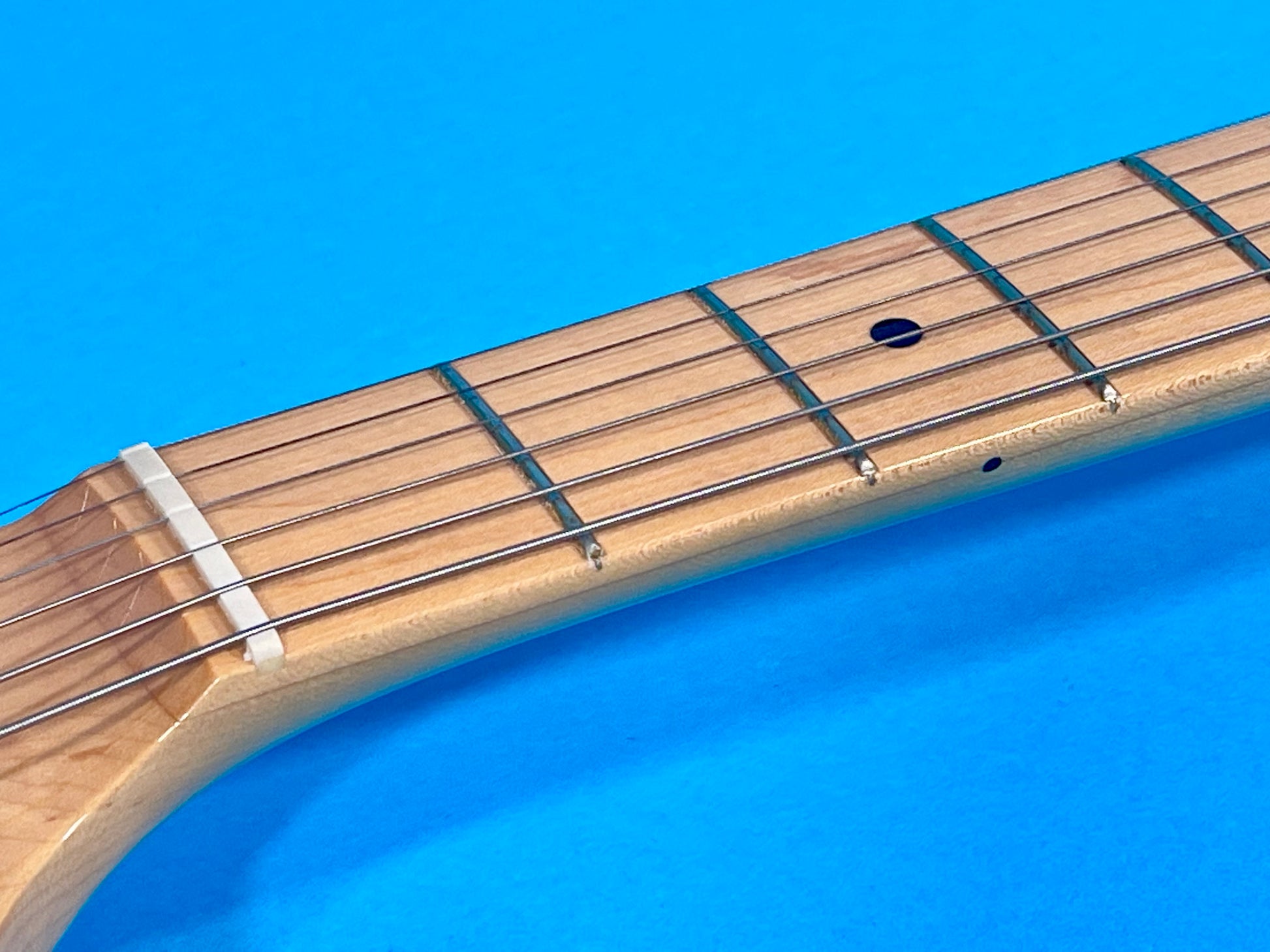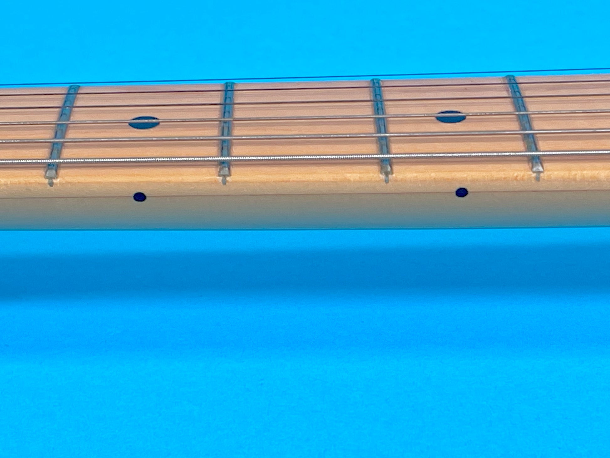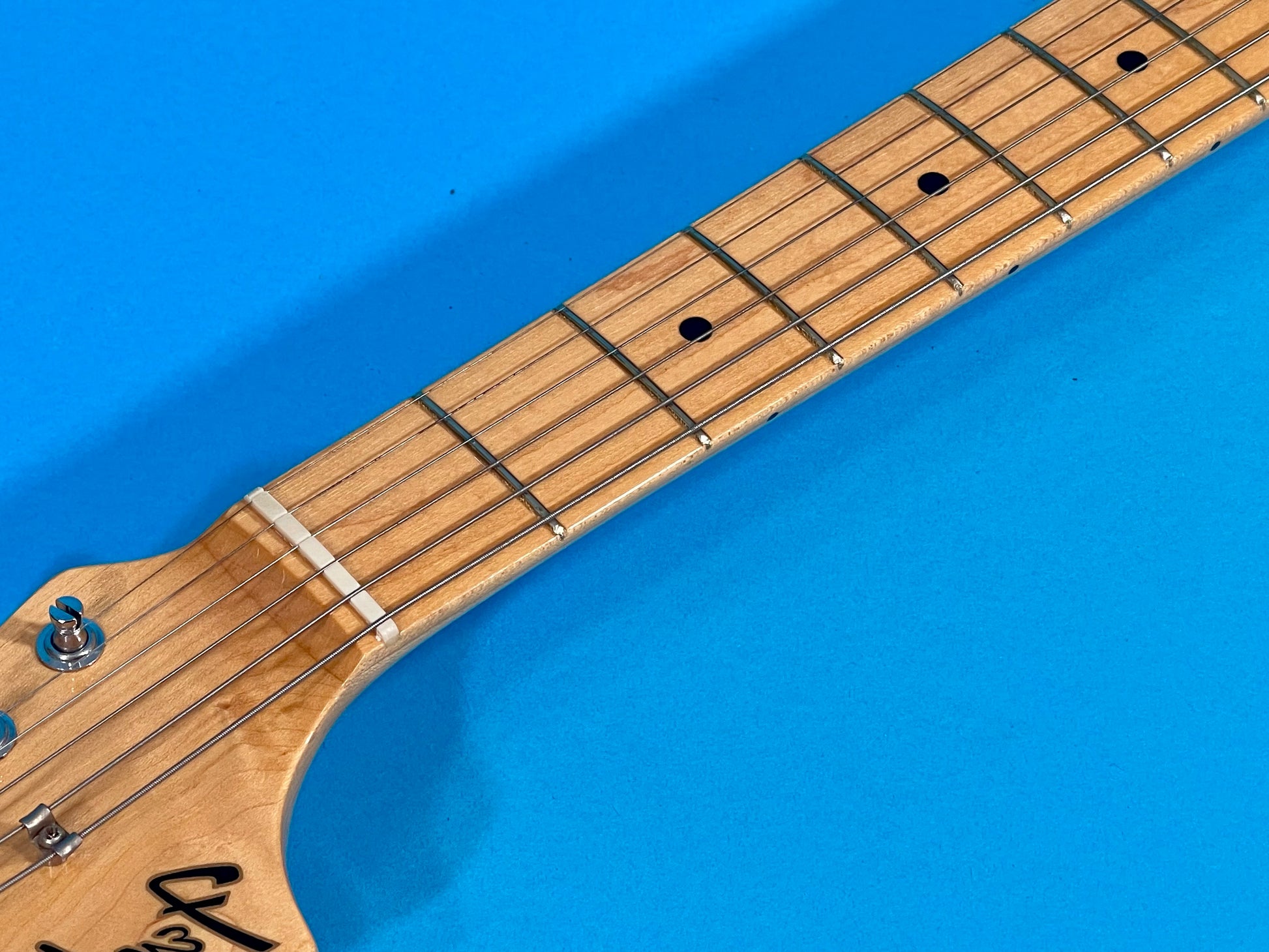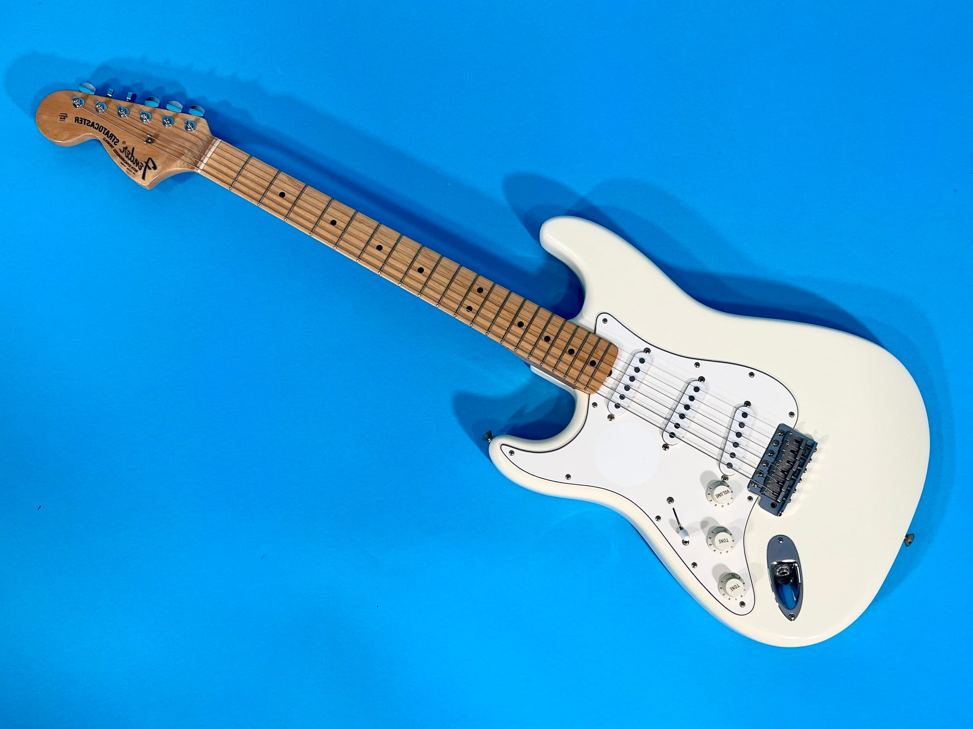 The body is super clean with deep contours front and rear. The Olympic white finish is glossy and looks absolutely killer. The neck plate is the special non-script Hendrix silhouette. The neck is straight and smooth and exceptionally clean. The neck profile is a typical vintage C shape and it feels amazing of course. The nut measures 1.68" (1 11/16") and the neck depth is .797" at the 1st fret and .915" deep at the 12th fret. The tuners all function smoothly. The headstock and reverse logo display awesome-flip your photo image and it looks like you're playing a real lefty. The Maple cap fingerboard is super clean. The frets are clean-maybe a little bit of whitening from just sitting around but near-new condition for sure. The action is low for a fast and easy playing experience. The string height measures .010" at the 1st fret and .040" at the 12th fret. The guitar plays really nicely with a soft touch.