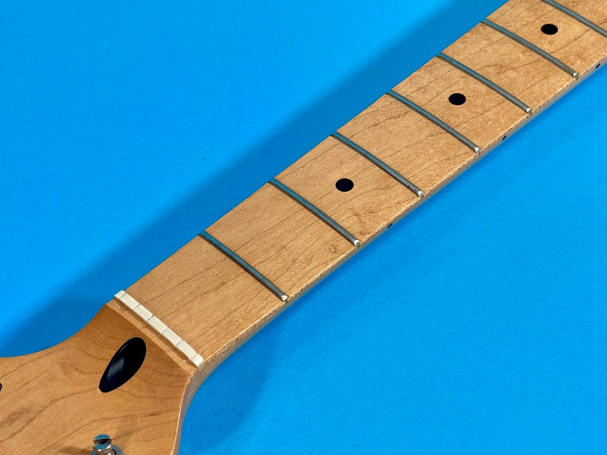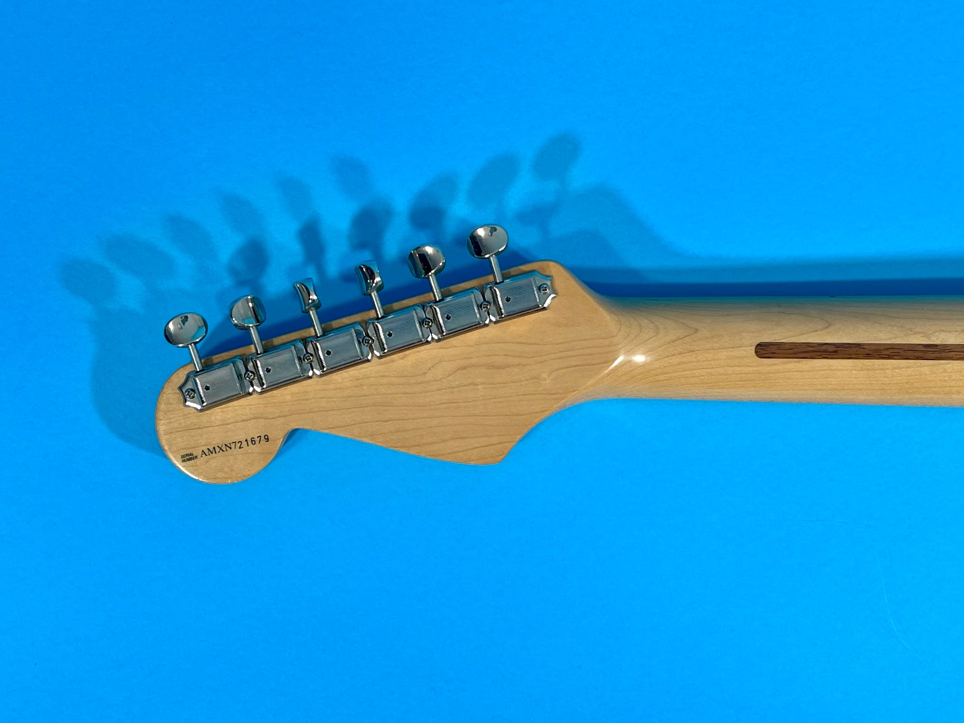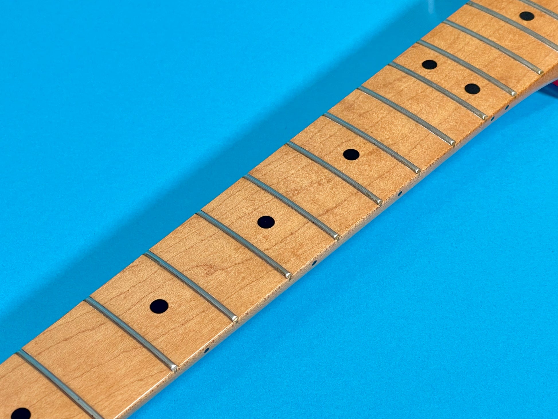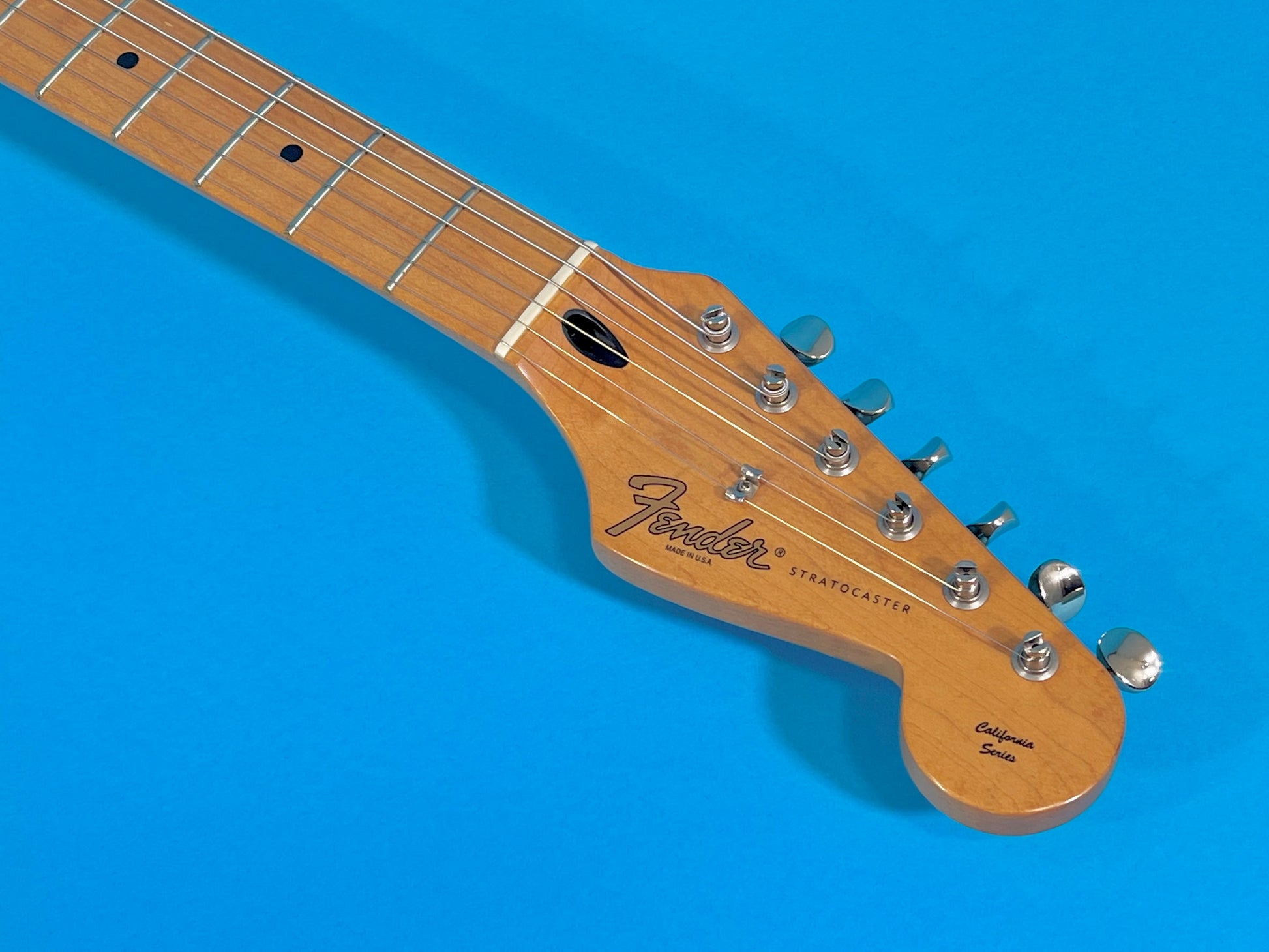 The neck is super straight and smooth. It has a satin finish that really feels nice. The neck has a modern C shape profile and the nut measures 1.66" wide for excellent string spacing. The neck depth measures .810" at the 1st fret and .870" deep at the 12th fret. The tuners function smoothly. The headstock and logo display excellent. The logo is a throwback to the 1965 style logo with 'Fender' in metallic gold with a black outline. It looks really cool. The maple fingerboard is exceptionally clean. The frets are near-new condition and super crisp-see photos. The action is set low for an easy playing experience. The string height is currently .010" at the 1st fret and .045" at the 12th fret. The guitar plays like butter up and down the fingerboard with a soft touch.