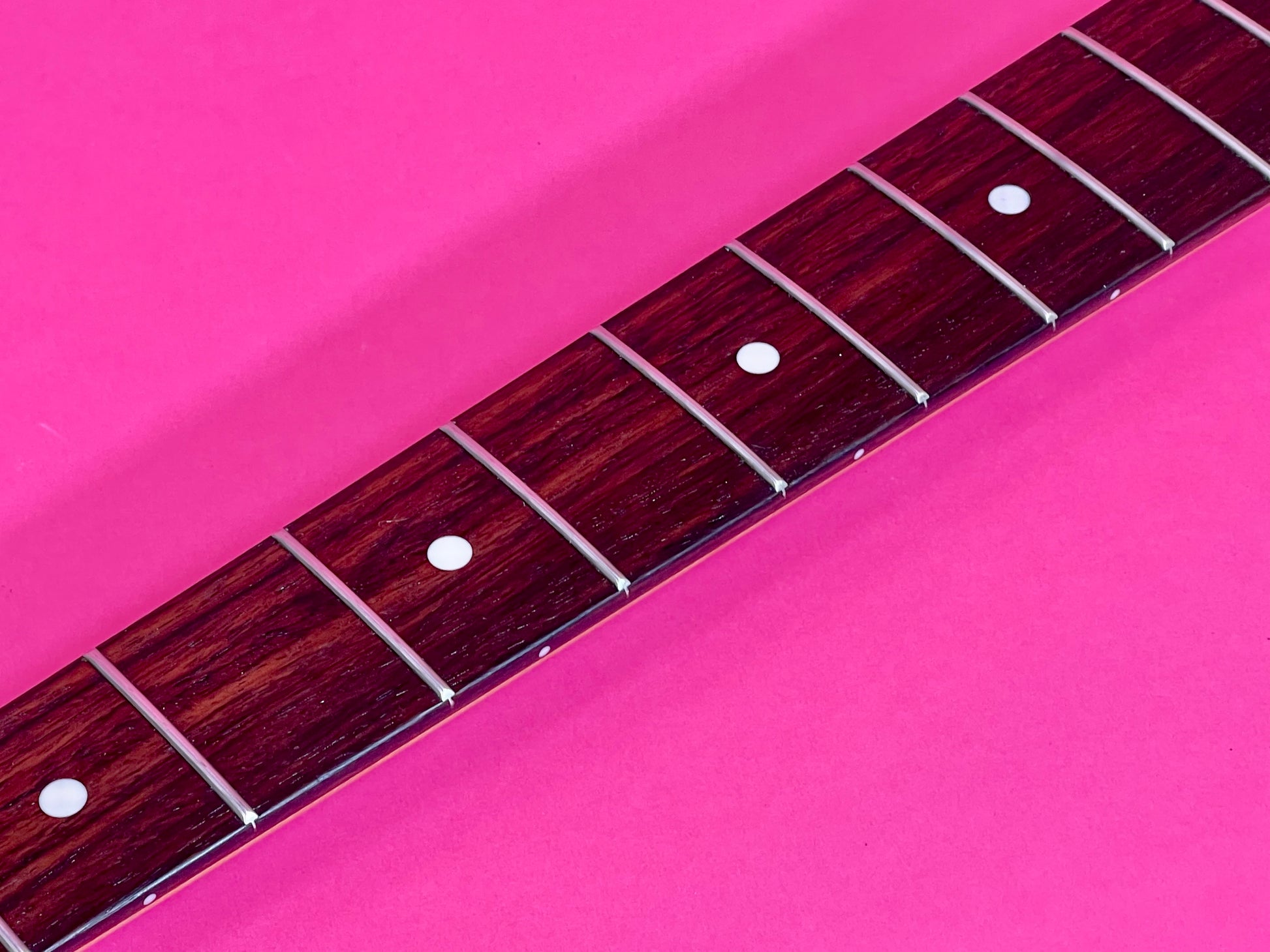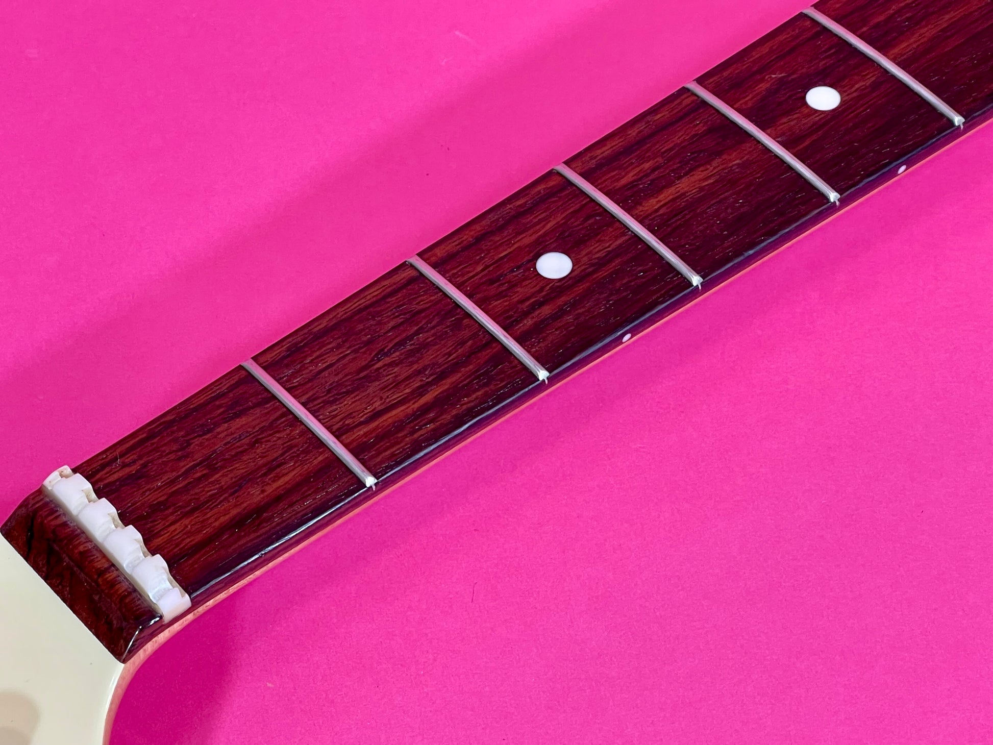 The Rosewood fingerboard is clean and very smooth. It really smooths out the tone and makes consistent playing a breeze. The frets have been polished and appear like-new condition-see photos. The action is low and the bass is really easy to play.