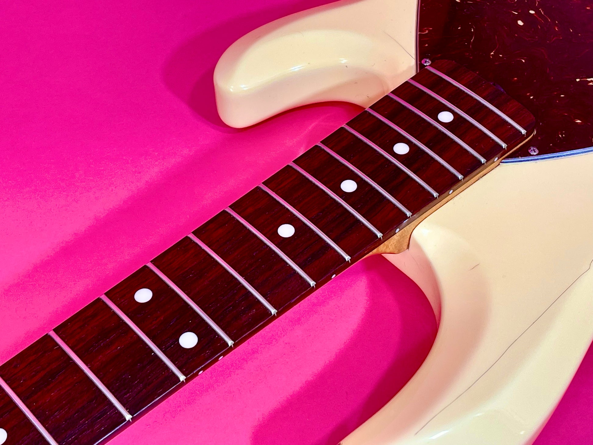 Produced at the Musician factory in San Luis Obispo California, U.S.A. in 2005. The body has nice lines and the Vintage Creme finish has toned to a nice Banana hue. There are a couple of line checks on the top, 2 on the side near the neck slot and some more checking in the contour on the backside-see photos. The checking really gives it that vintage look in my opinion. There are other signs of handling here and there, overall the finish looks nice. On the back, there is a "2005 Limited Edition" decal near the neck plate.