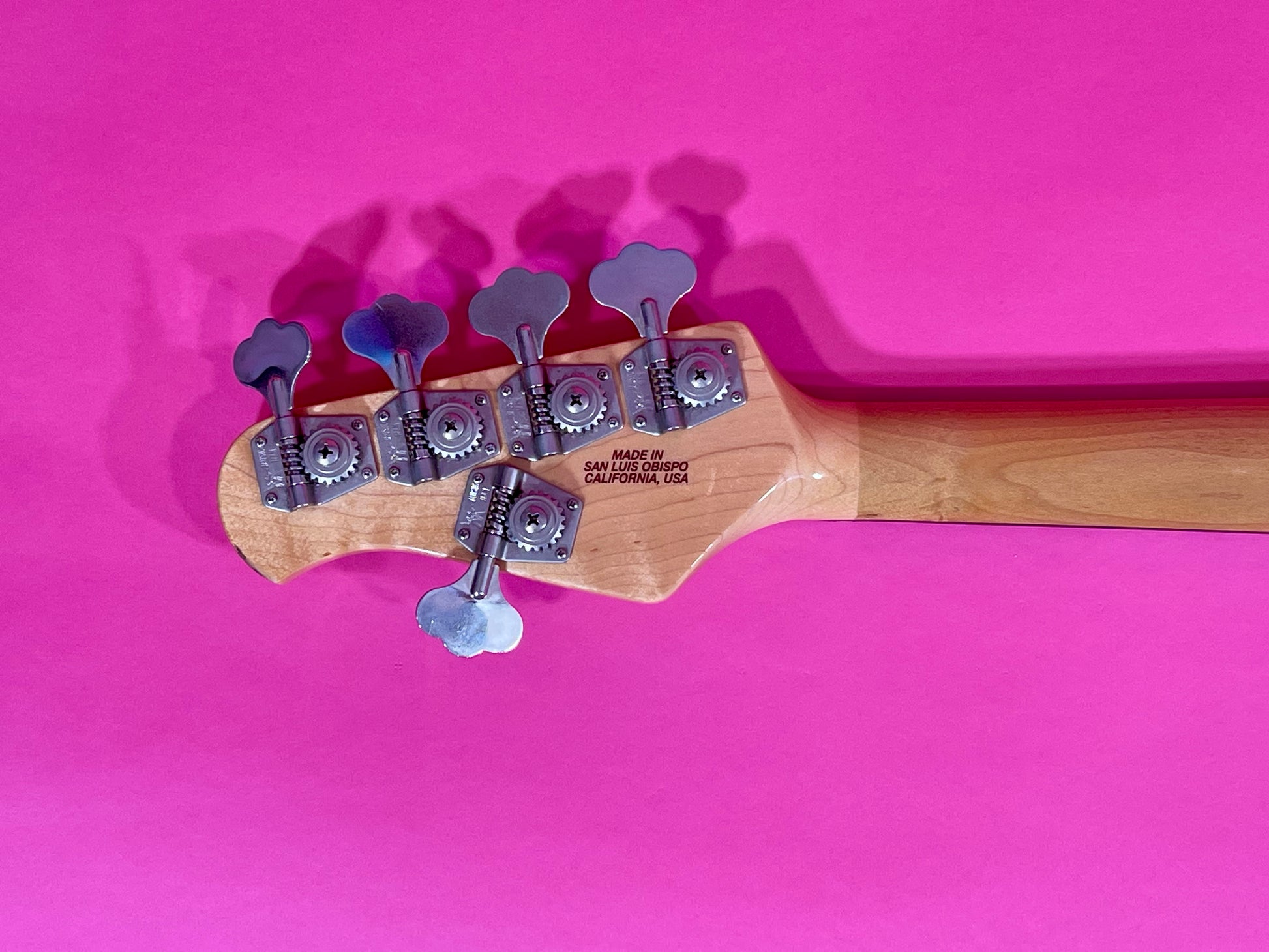 The neck is a solid fitment and the neck itself is smooth and super straight. The neck is 1.758" wide at the nut. The neck depth measures .785" deep at the 1st fret and .939" at the 12th fret. The nickel tuners all turn smoothly and the bass stays in tune perfectly. The headstock matches the body color and it looks great, along with the logo.
