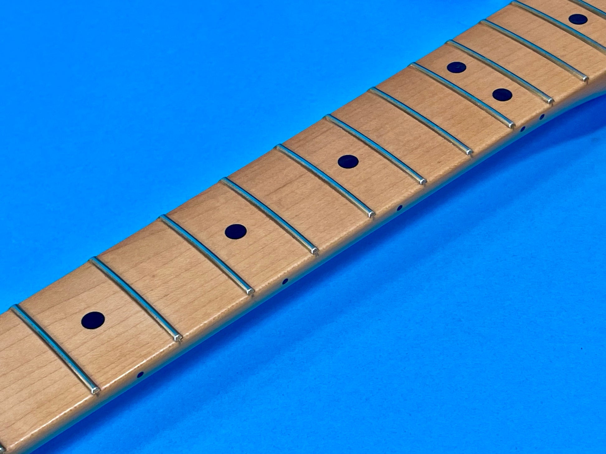 The body is clean with nice deep contours and the finish shines nice and glossy-see photos. The finish is clean on the front sides and back. There is a tiny line in the clear somewhere near the strap pin on the front. It is too small to capture with a camera and not really noticeable anyway. The neck is an excellent fitment and the satin finish gives it a super smooth feel. It is laser straight as well. The neck profile is the Modern D shape, according to Fender. it feels really good. The neck depth measures .847" at the 1st fret and .900" at the 12th fret. The nut measures 1.70" wide. The Ultra series comes with rolled edges for added comfort. The original locking tuners all function smoothly. The headstock and logo display excellent. The maple fingerboard is clean and exhibits minimal handling wear, if any-see photos. The frets are polished and clean, free of any playing evidence. The string height is set at .010" at the 1st fret and .050" at the 12th for a low fast action that is easy to play. The guitar plays excellent up and down the fingerboard with zero issues. It shred!
