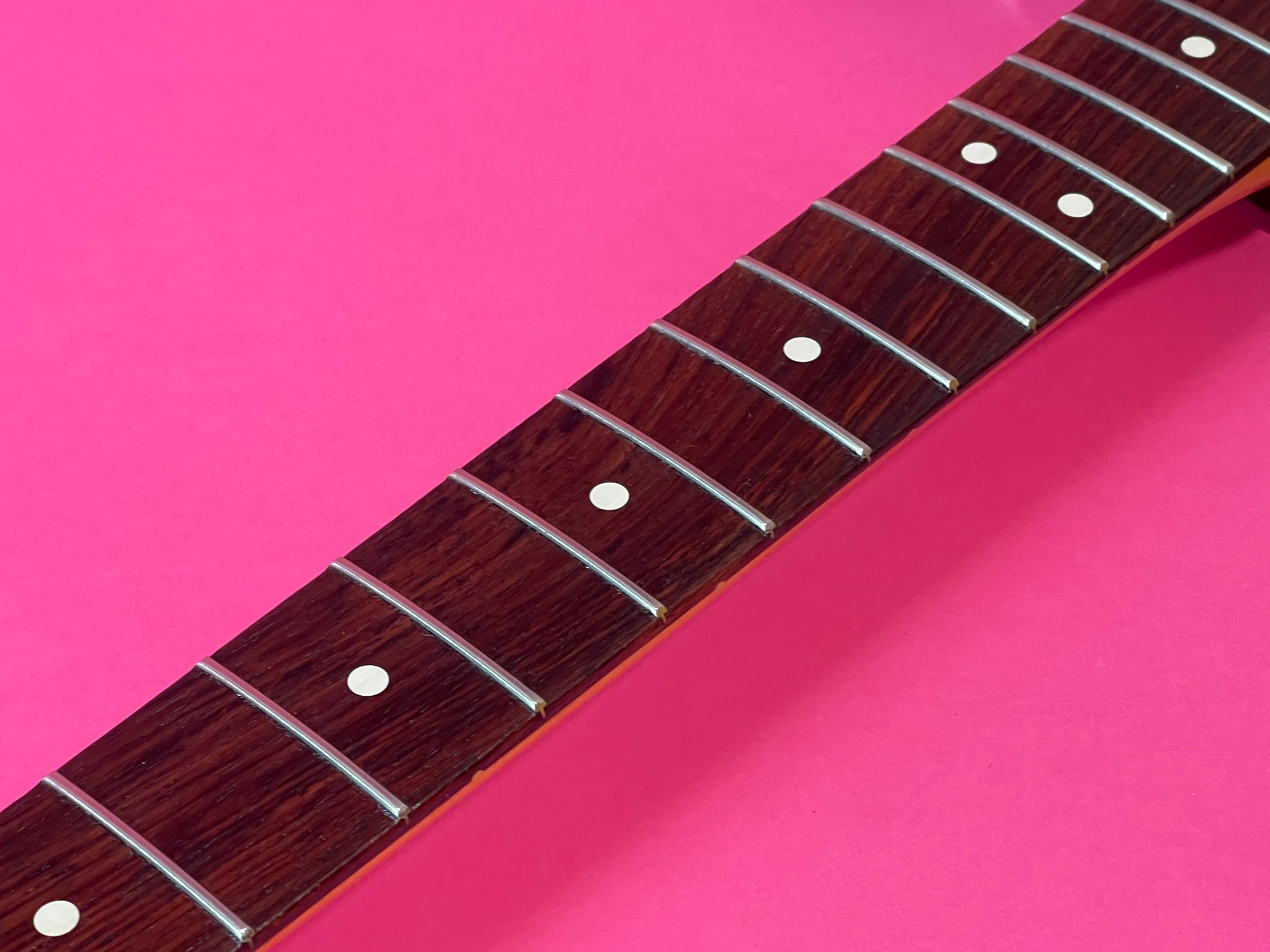 The Comet Burst finish really brings out the fire in the flamed maple top. The finish is nice and glossy and it just glows-very striking. The Comet Burst features a softer dark brownish edge like a vintage Stratocaster would have, rather than just a black. It is a really warm look and nicely compliments the beautiful woodgrain. The neck is straight and has a really comfortable deep-C profile. The neck depth measures .824" at the 1st fret and .895" at the 12th fret. The nut measures 1.71" wide. The Rosewood fingerboard is smooth with a very soft touch and Fender rolled the edges fro a super-comfortable playing experience. The original locking tuners all function perfectly and the headstock and logo display excellent. The frets are like new condition-see photos. The fingerboard looks untouched as well-it is super clean. The string height is currently .010" at the 1st fret and .050" at the 12th for a perfect action. The guitar plays lights out up and down the fingerboard with an easy soft touch. The frets are Tall and really crisp.