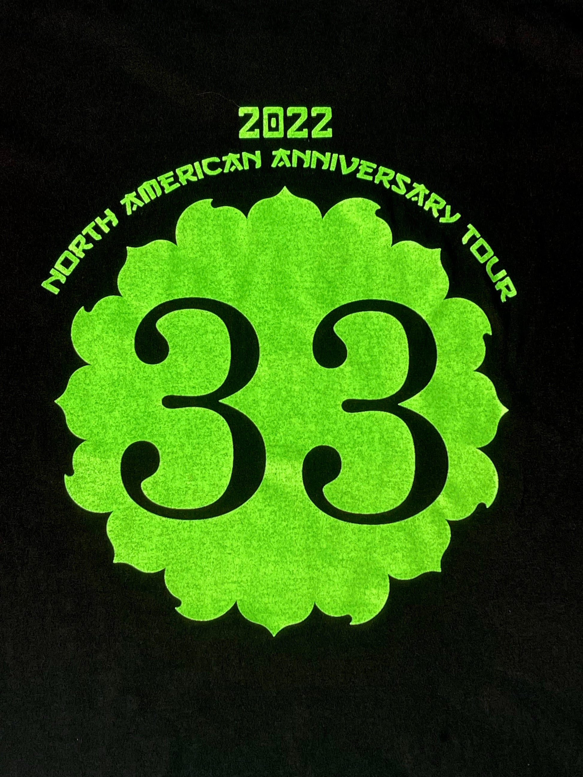 Made with love and attention to detail, these shirts feature the OG Blackguard Draggin' Guitars Logo design hand-silkscreened in Sublime Green ink on front. On the back, the Kansas State Highway Sunflower with large "33" and "2022 anniversary tour" are also printed in Sublime Green-so EVERYONE knows what time it is.
